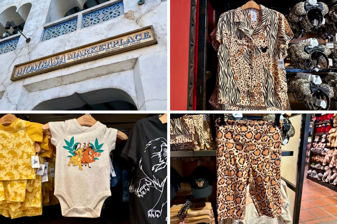 Collage of Mombasa Marketplace sign and safari-themed clothing displays, including leopard and lion prints reminiscent of Disney’s Animal Kingdom, featuring new merchandise for children's and women's apparel.