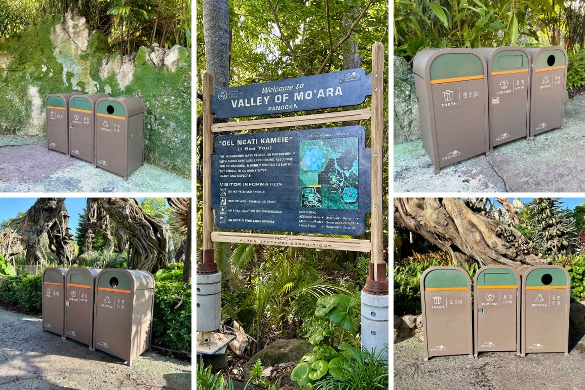 Collage of trash and recycling bins in a park with a sign that reads "Welcome to Valley of Mo'ara, Pandora," surrounded by lush greenery and pathways, capturing the enchanting ambiance of Disney's Animal Kingdom.