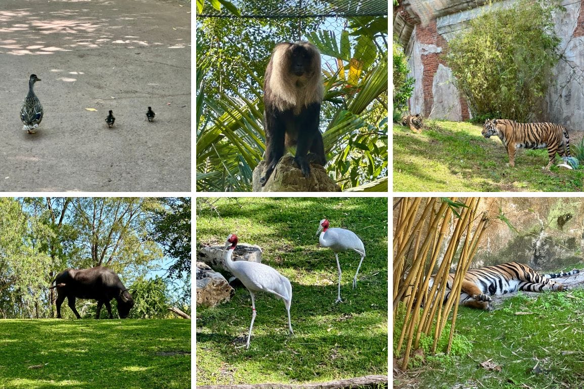 Collage of six animal images: a duck with ducklings, a monkey on a log, two tigers on grass, buffalo grazing, two cranes standing, and a tiger resting near bamboo—capturing the enchanting vibe of Disney's Animal Kingdom.
