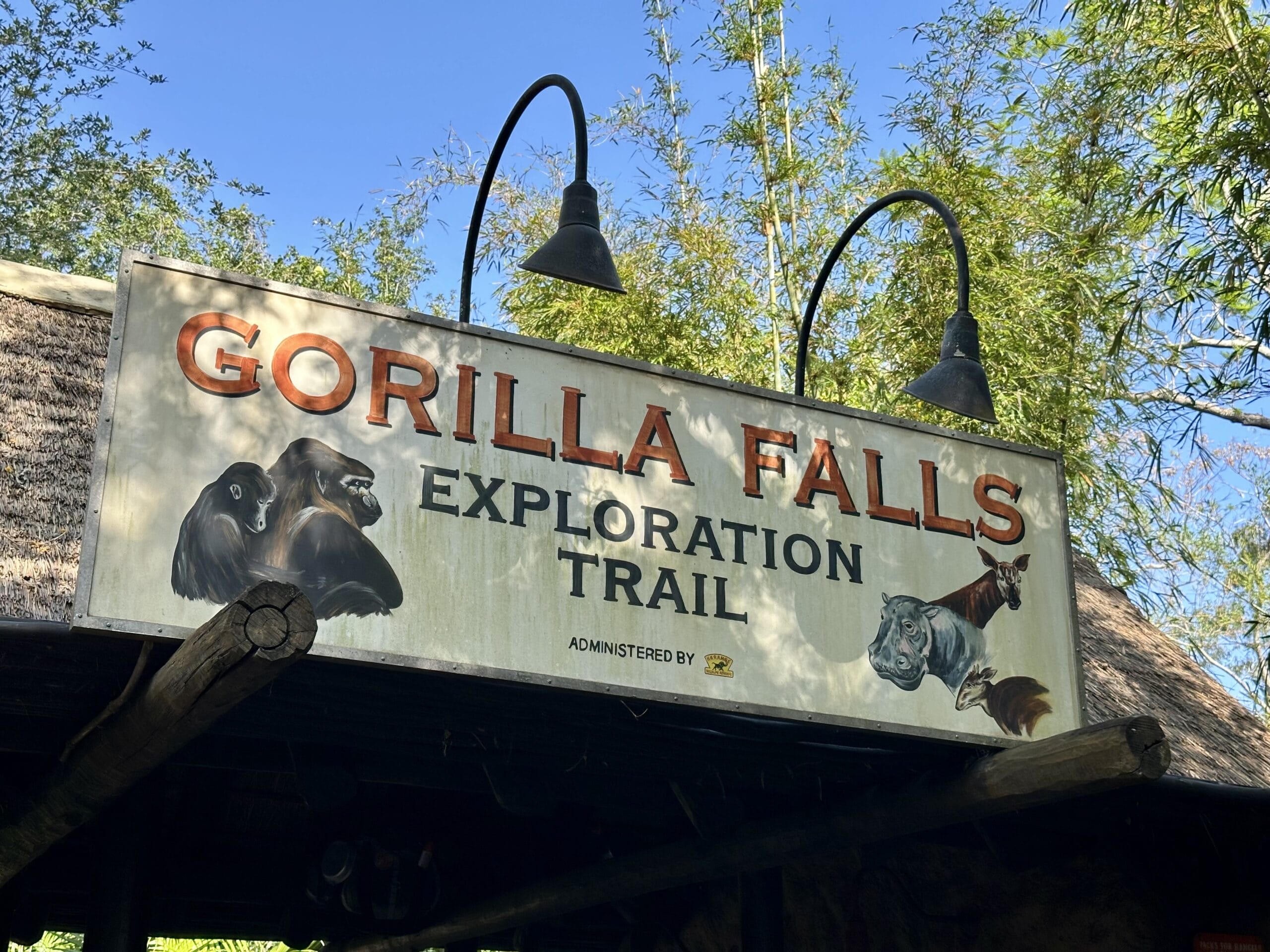 A sign reading "Gorilla Falls Exploration Trail" showcases illustrations of a gorilla, rhino, and bird beneath two black lights. This enchanting scene, surrounded by trees, brings the adventure of Disney’s Animal Kingdom to life.
