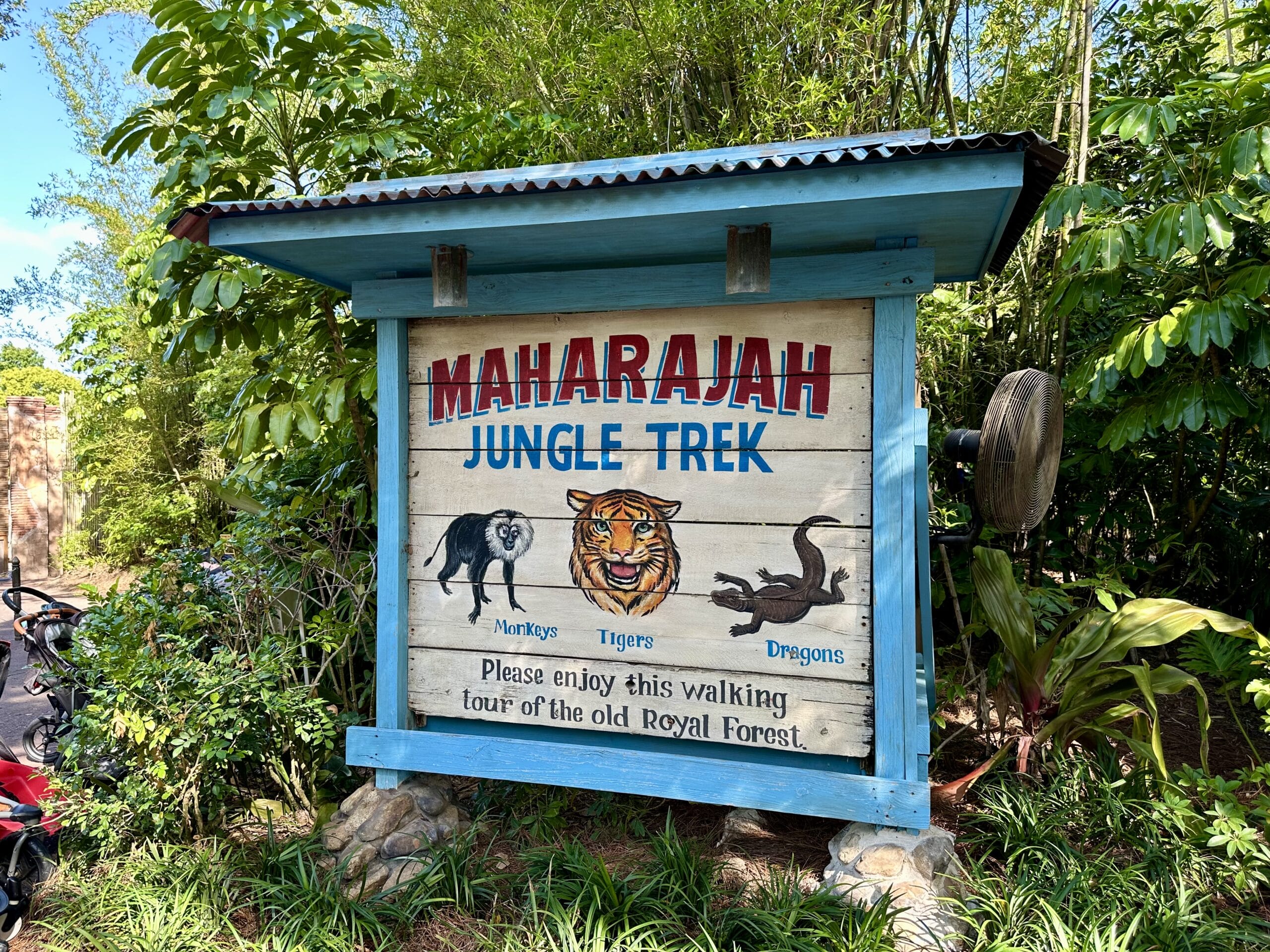 Sign for Maharajah Jungle Trek with illustrations of a monkey, tiger, and dragon; enveloped by lush greenery. Text highlights a walking tour of the old Royal Forest in Disney’s Animal Kingdom. Perfect for those exploring new merchandise after the adventure.