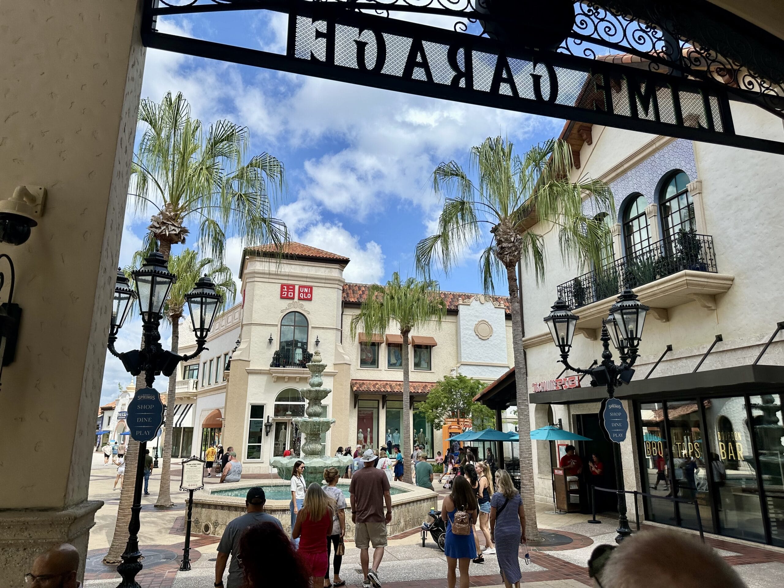This outdoor shopping area, reminiscent of Disney Springs, features people strolling past palm trees and Mediterranean-style buildings. With a fountain, street lamps, and a Uniqlo store offering new merchandise, it's an inviting destination for all.