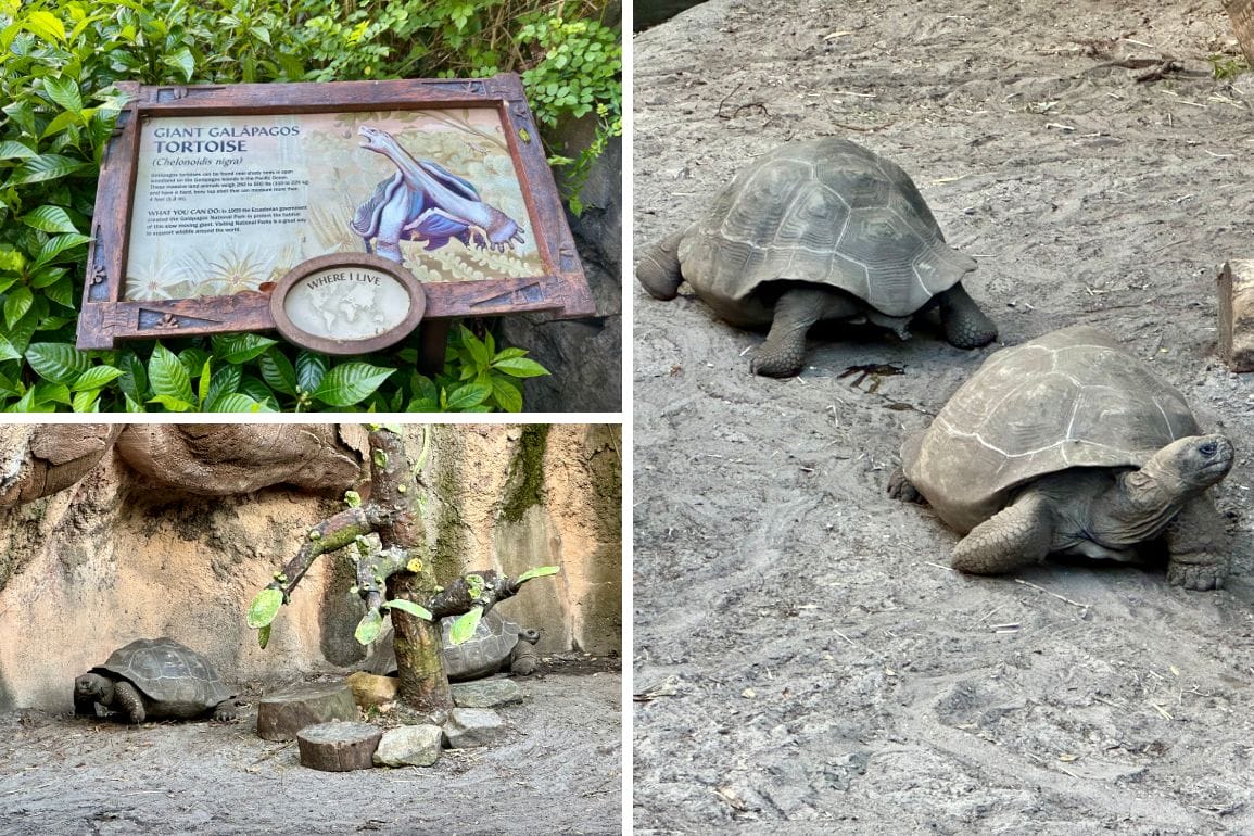 Split image depicting Galapagos tortoises at Disney's Animal Kingdom: a sign about the species, two tortoises on sandy terrain, and one moving gracefully near vegetation and rocks.