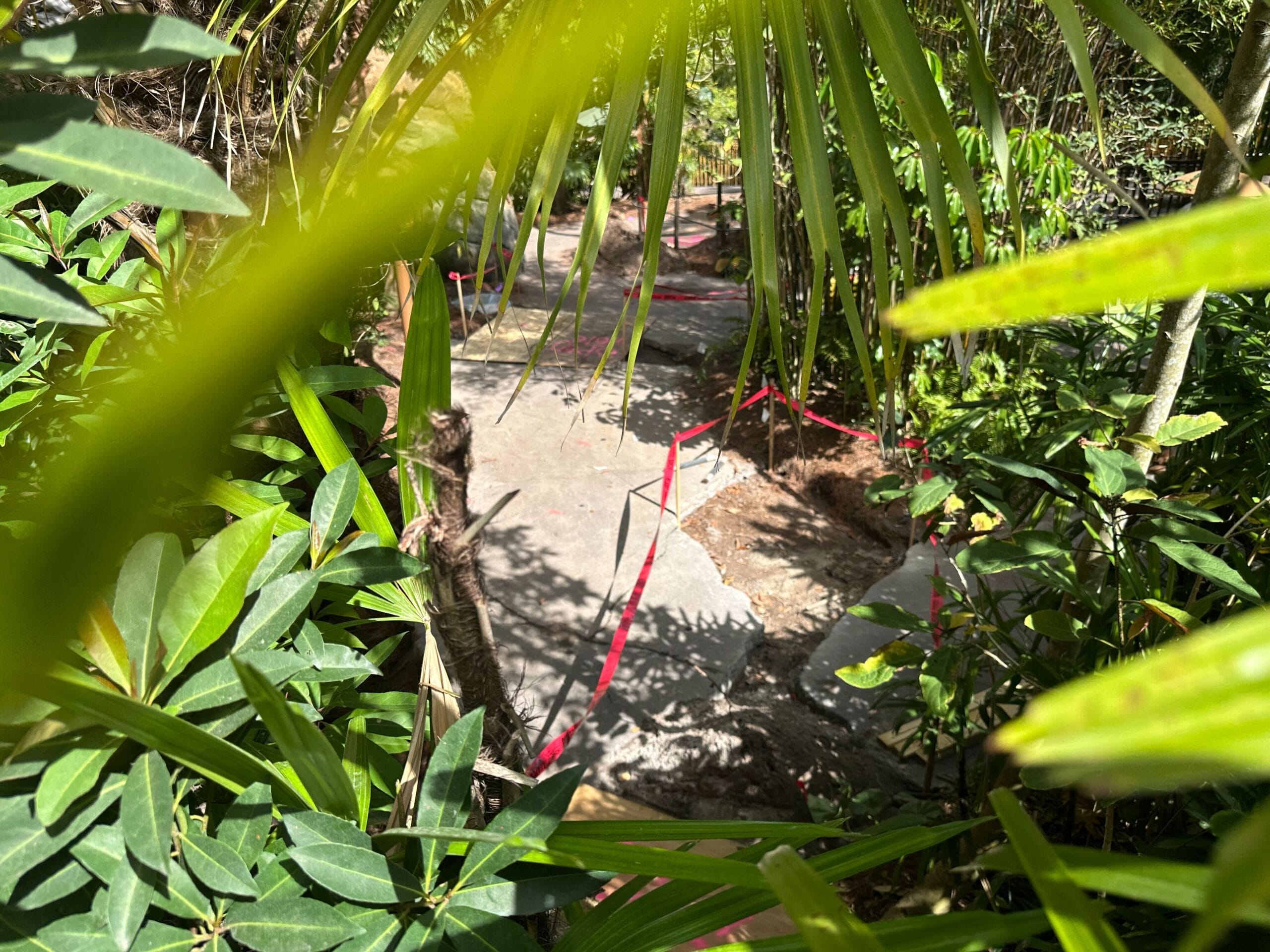 Patches of pavement in some areas of the walkway have been torn up and marked off with red tape.