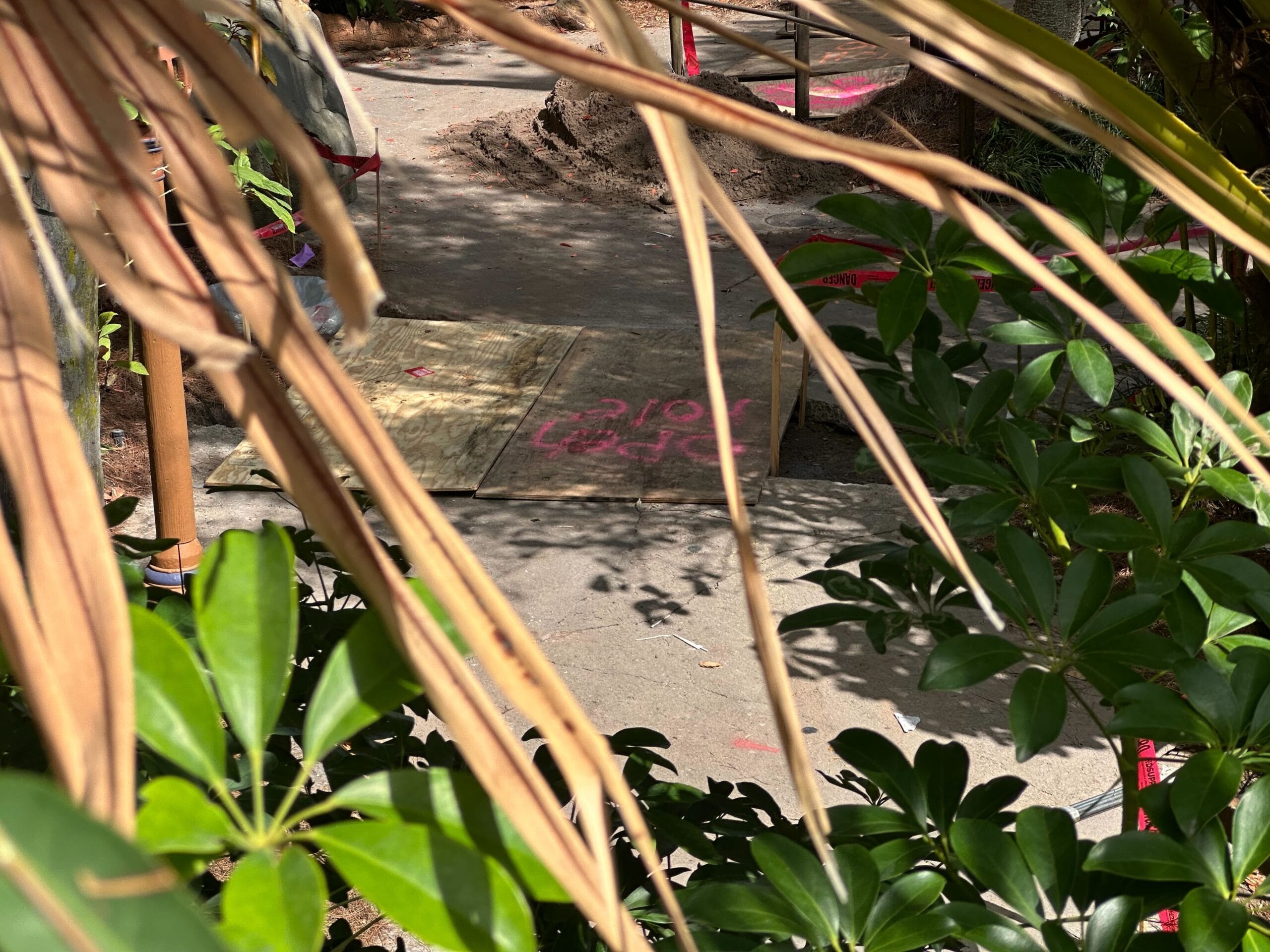 Other areas of the walkway are covered in plywood with the words “open hole” spray-painted on it as pavement work is done.