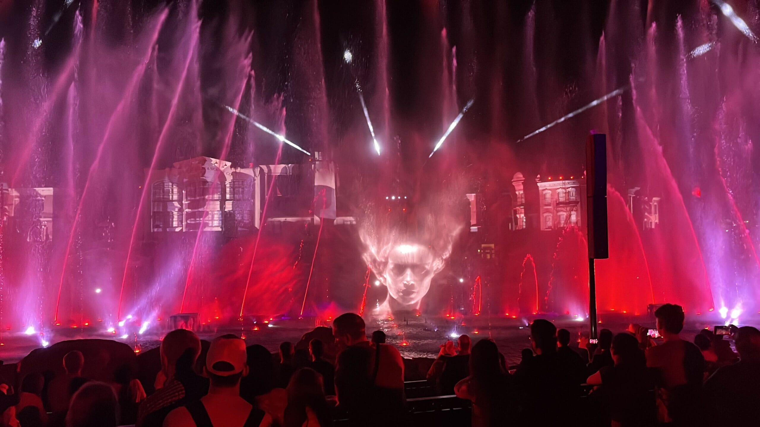 The CineSational Symphonic Spectacular at night dazzles with fountains and a mesmerizing light show, featuring colorful water jets and projected visuals. Enjoy the spectacle from a safe distance—no drones allowed among the captivated spectators in the foreground.