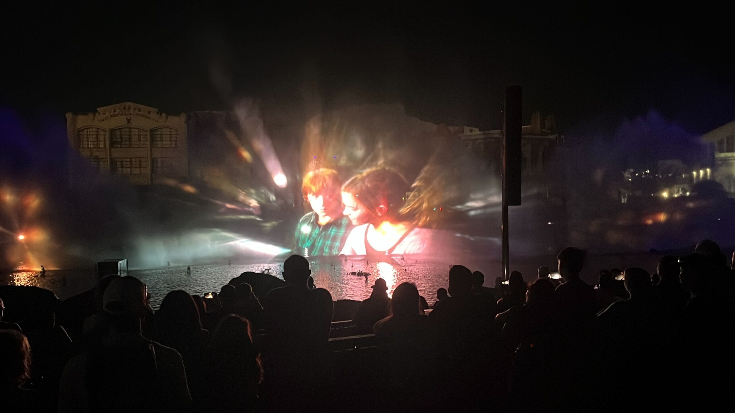 A crowd gathers to watch the CineSational Symphonic Spectacular, a nighttime water and light show at Universal Studios Florida. Images of two people are projected onto a mist screen over the water, surrounded by dazzling lights and scenic buildings, all without the use of drones.