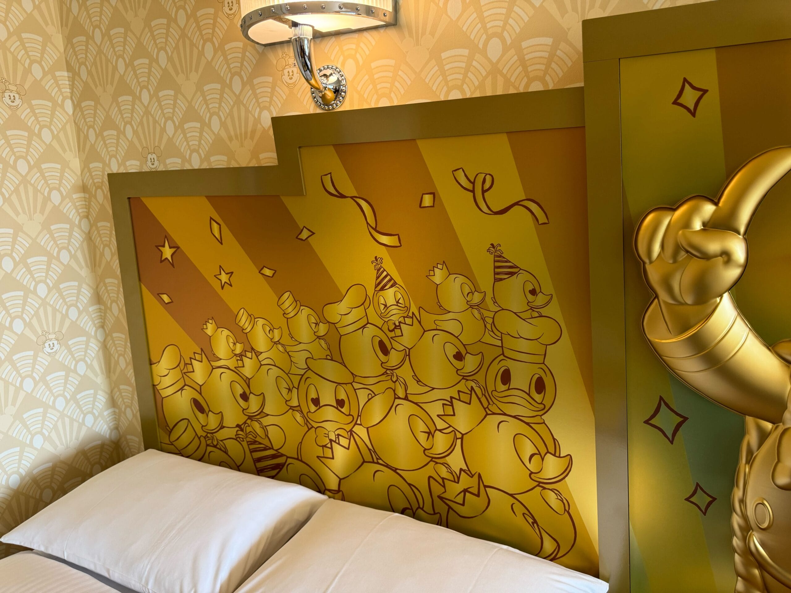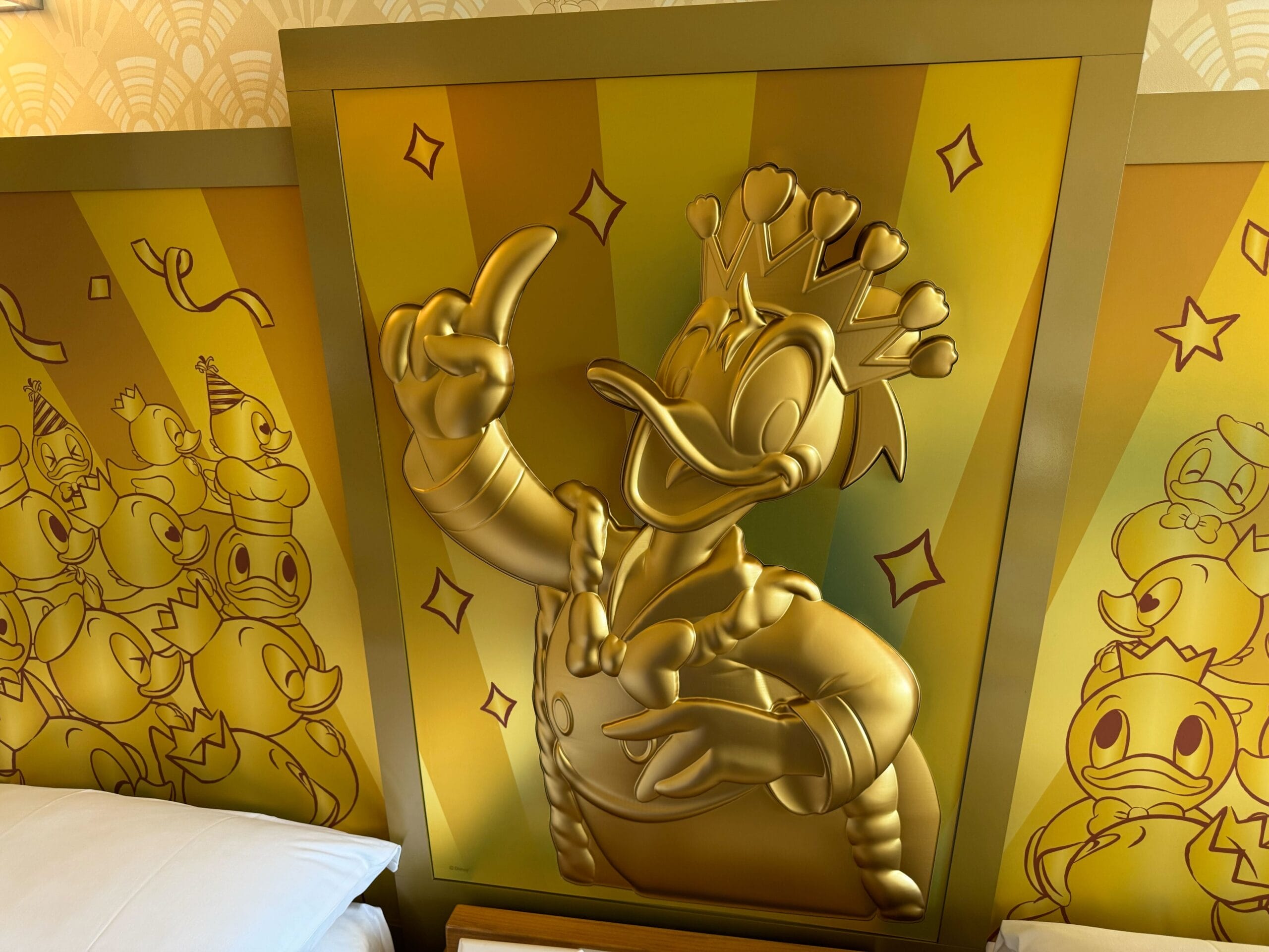 For this special occasion, the bedspreads feature images of Donald and there’s a golden Donald headboard. There are mounted lamps above the headboard.