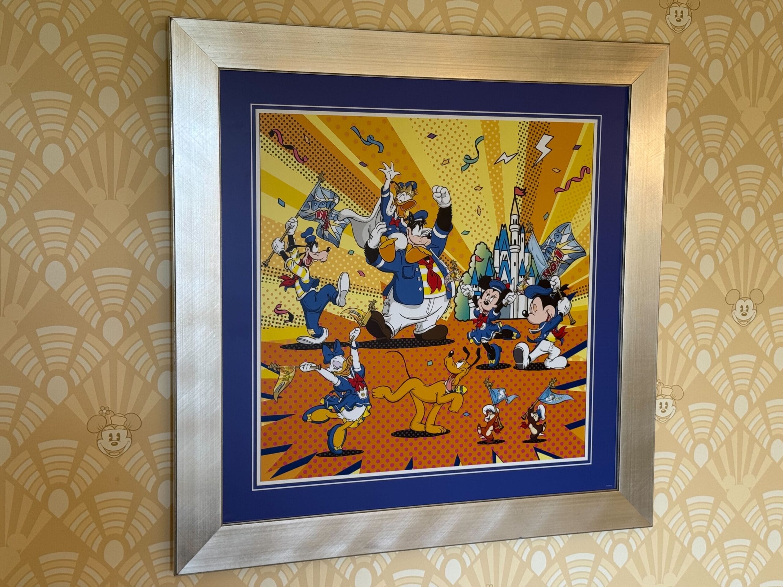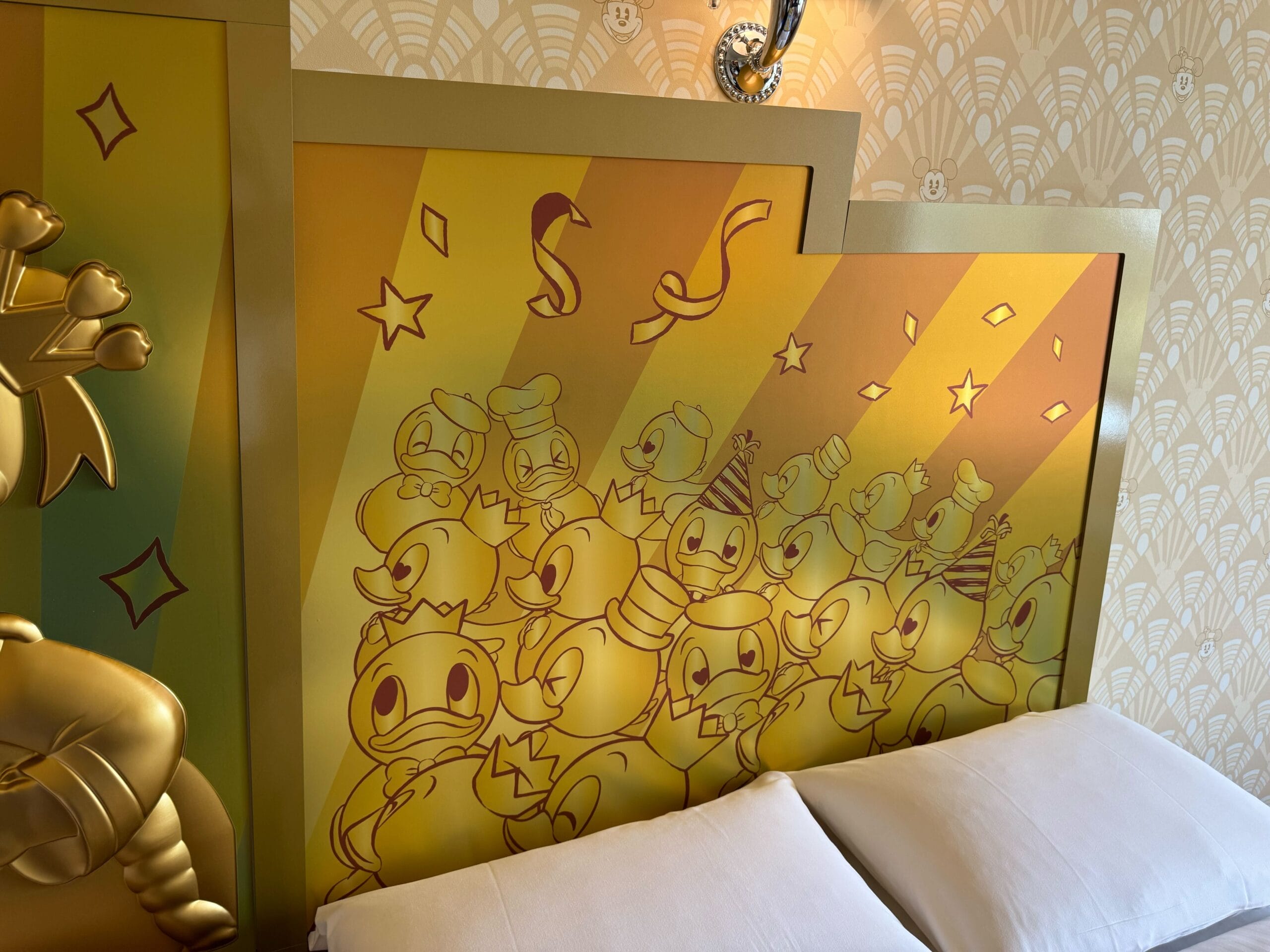 Artwork on the wall to the sides of the beds depicts Donald and all his friends. The gang is all wearing blue and white sailor-inspired outfits. Donald is on Pete’s shoulders. Cinderella Castle is in the background.