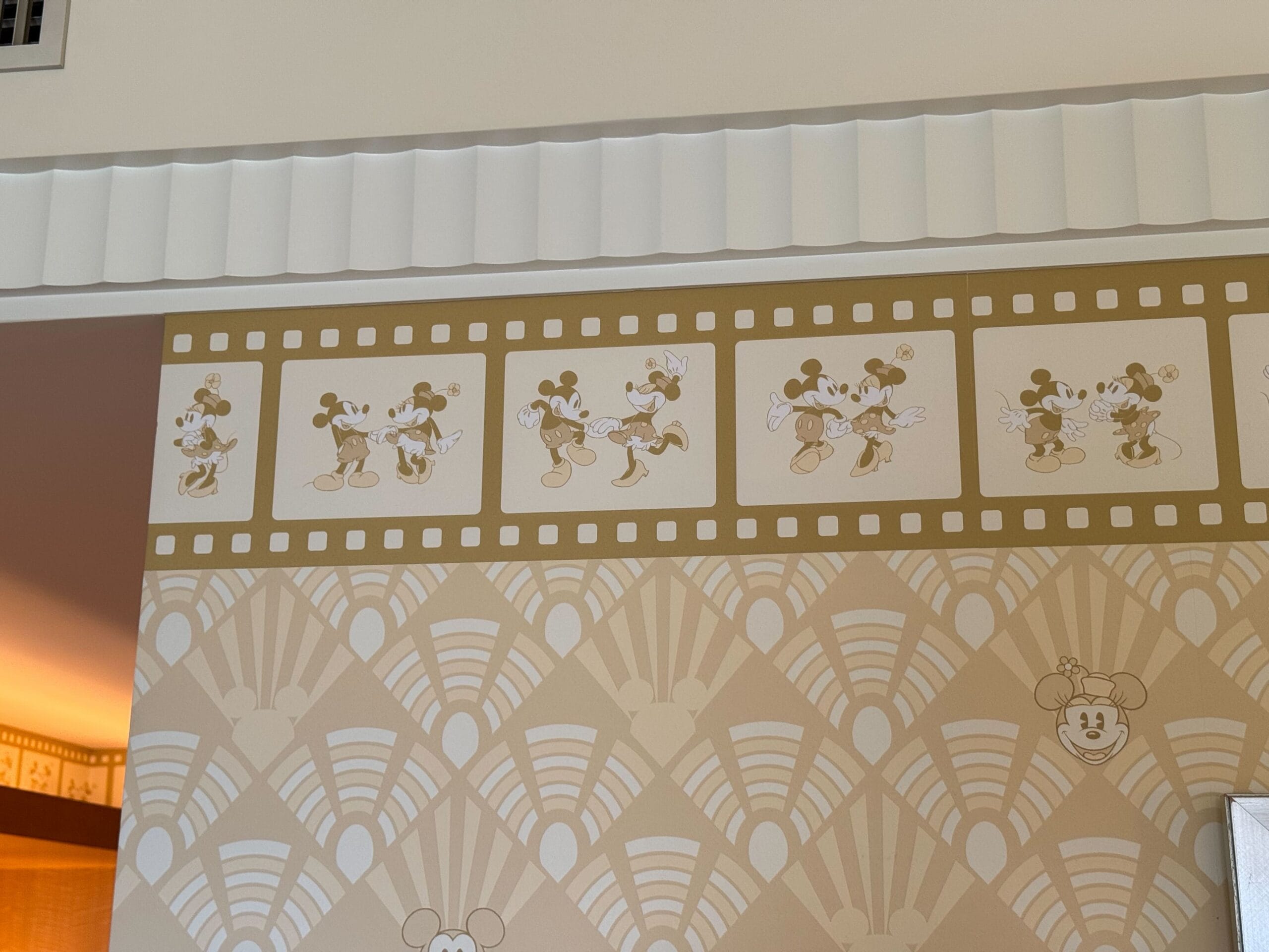 The room’s wallpaper is shades of beige with an art deco pattern featuring Mickey and Minnie’s faces. Around the top of the walls is a film strip featuring the couple in different poses.