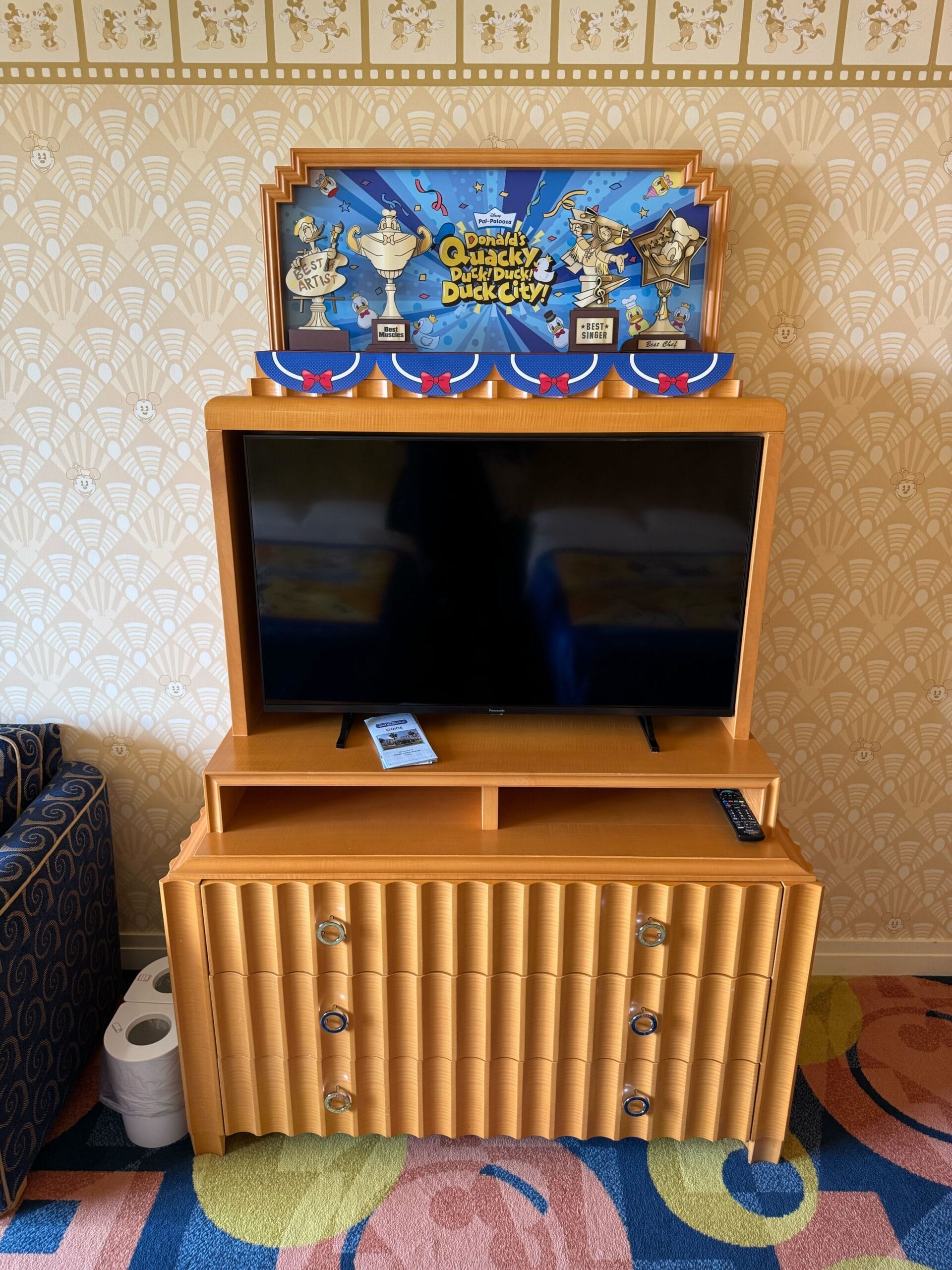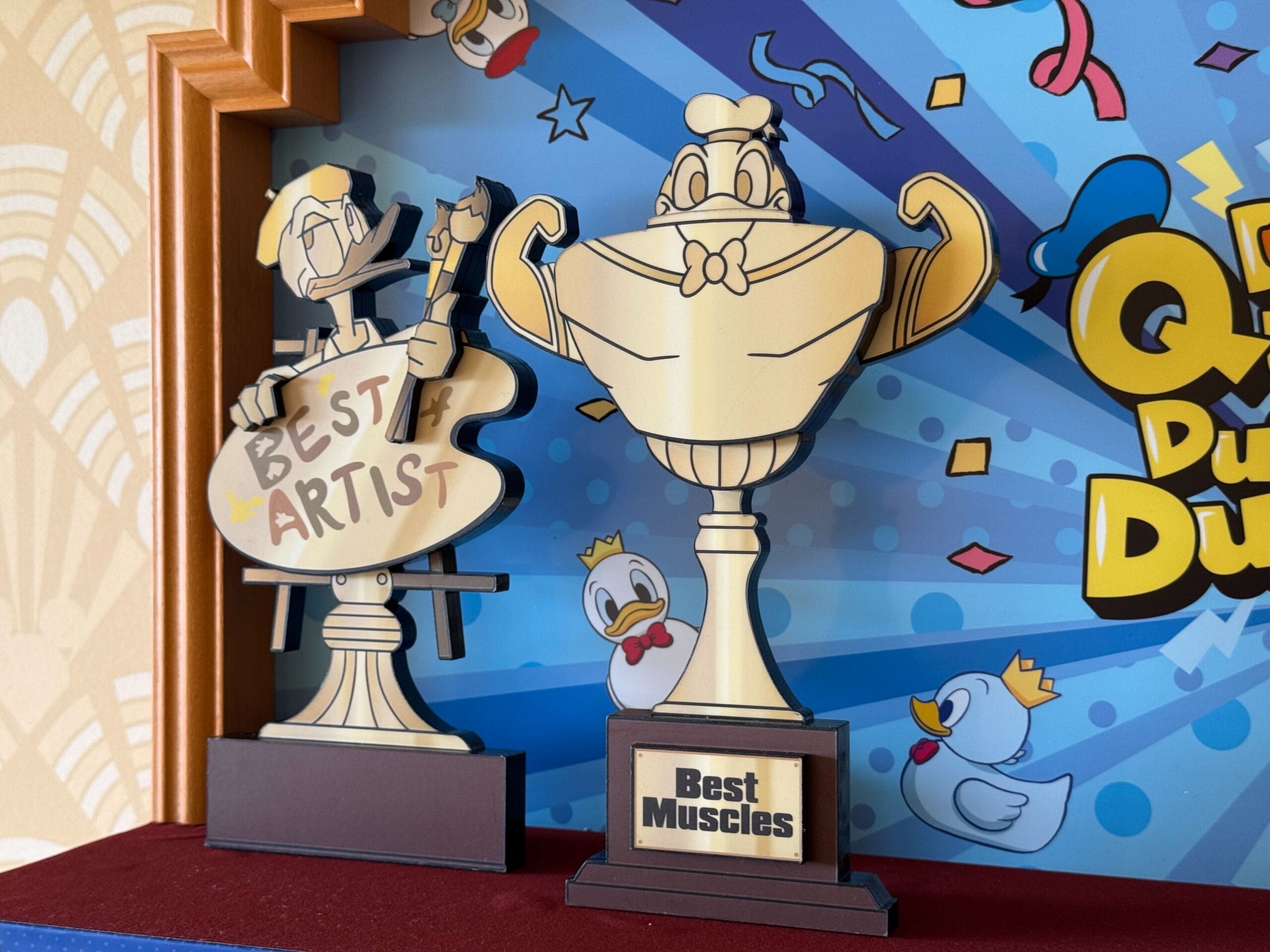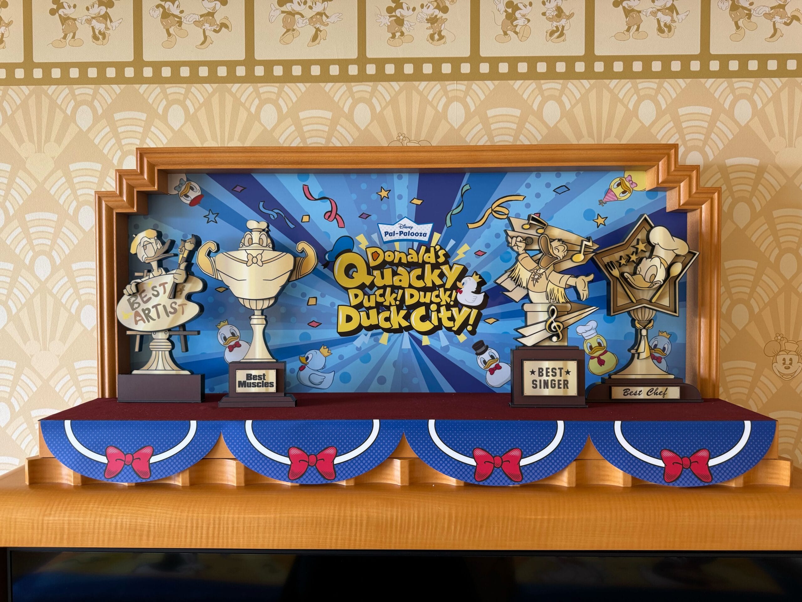Above the TV is a dimensional display of Donald’s trophies in front of a Donald’s Quacky Duck! Duck! Duck City!” background. Donald-inspired bunting is below the display.