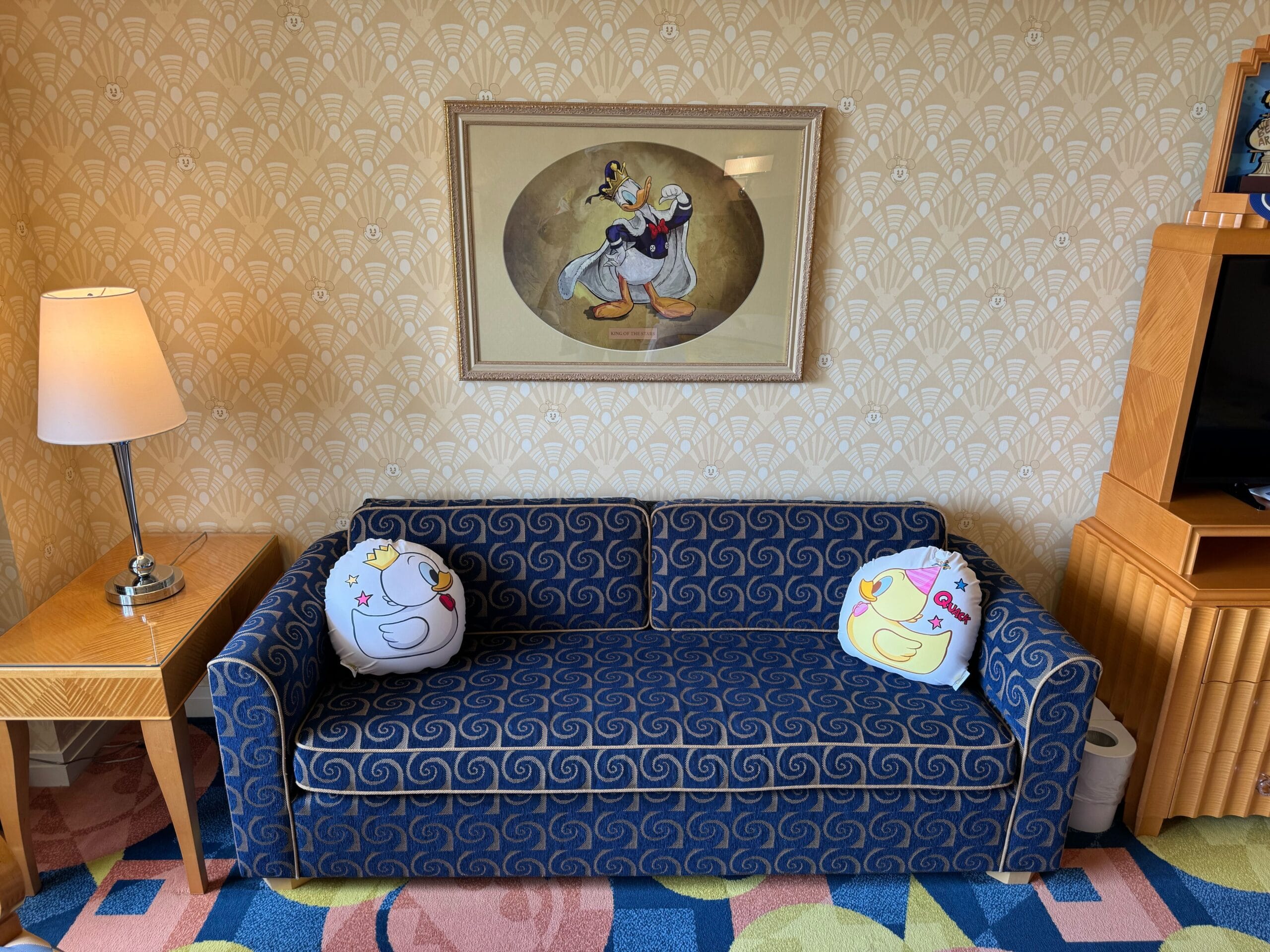 The couch is always blue and gold, but the colors are extra appropriate for this celebration of all things Donald. It has a swirl pattern and two rubber duck throw pillows.