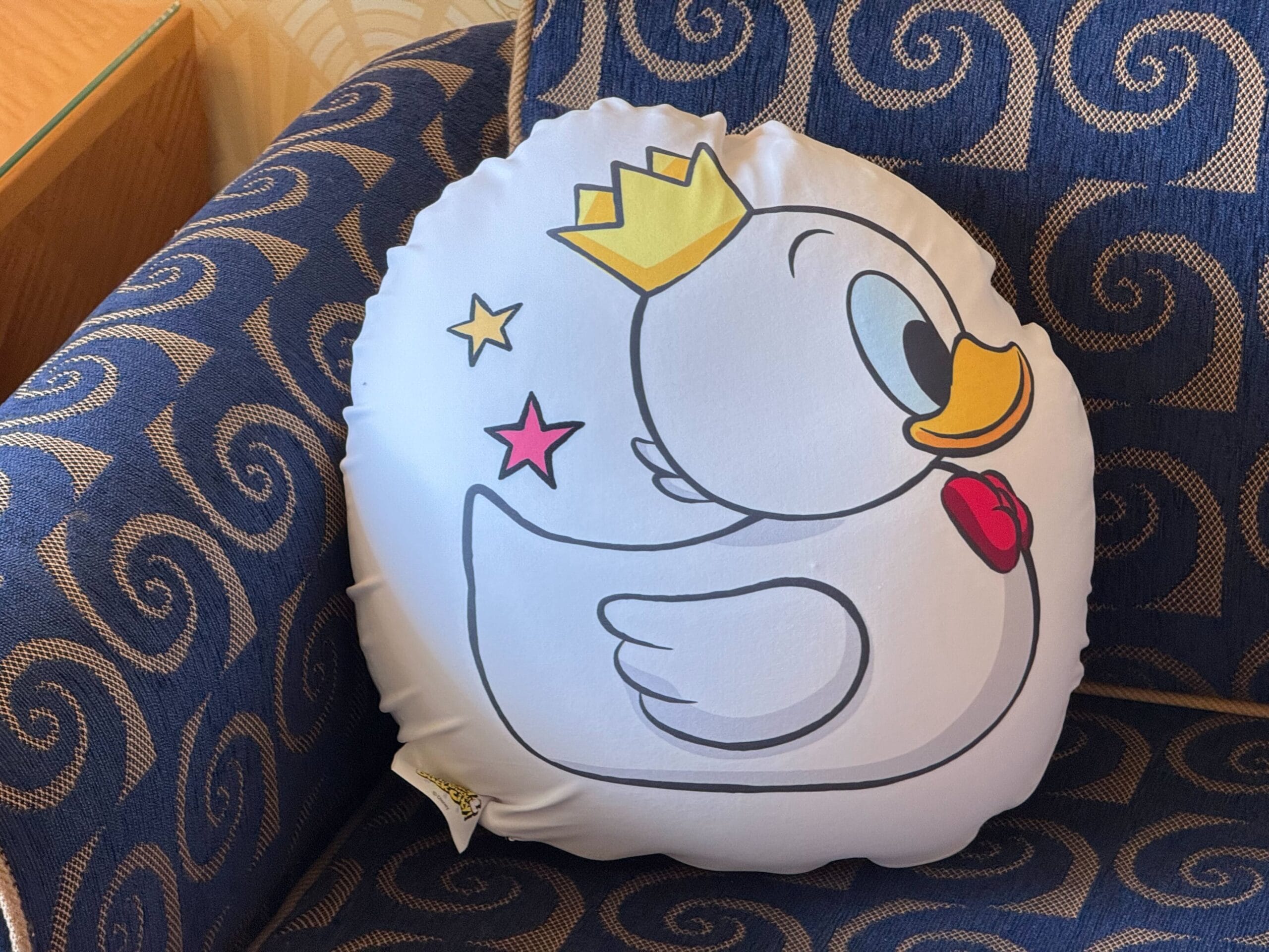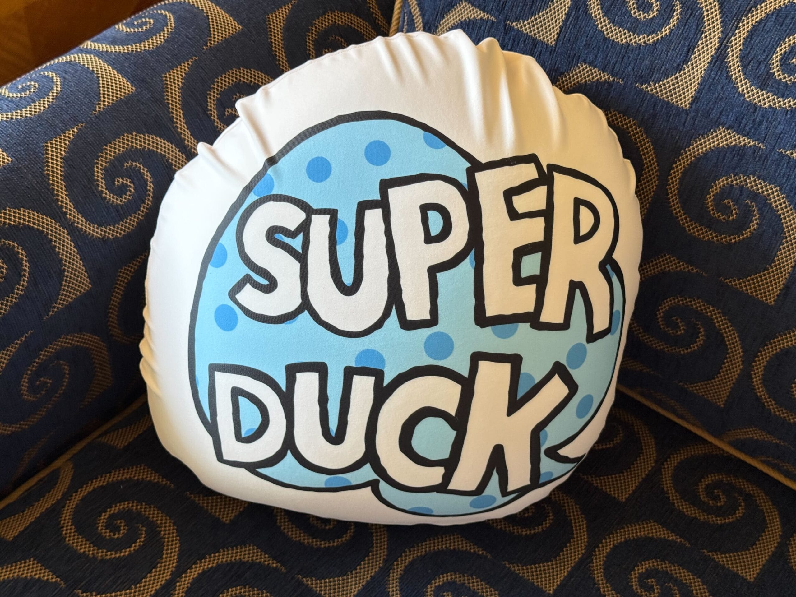 One pillow features a white duck in a king’s crown. On the other side is a blue comic-style speech bubble saying “Super Duck.”