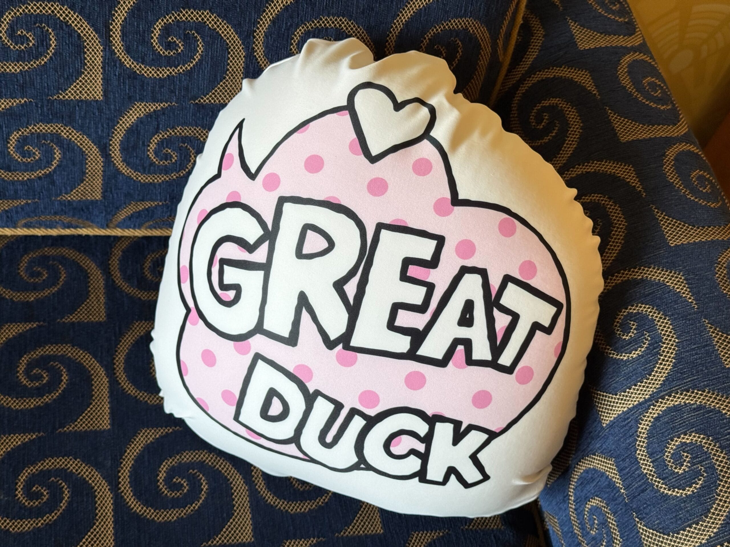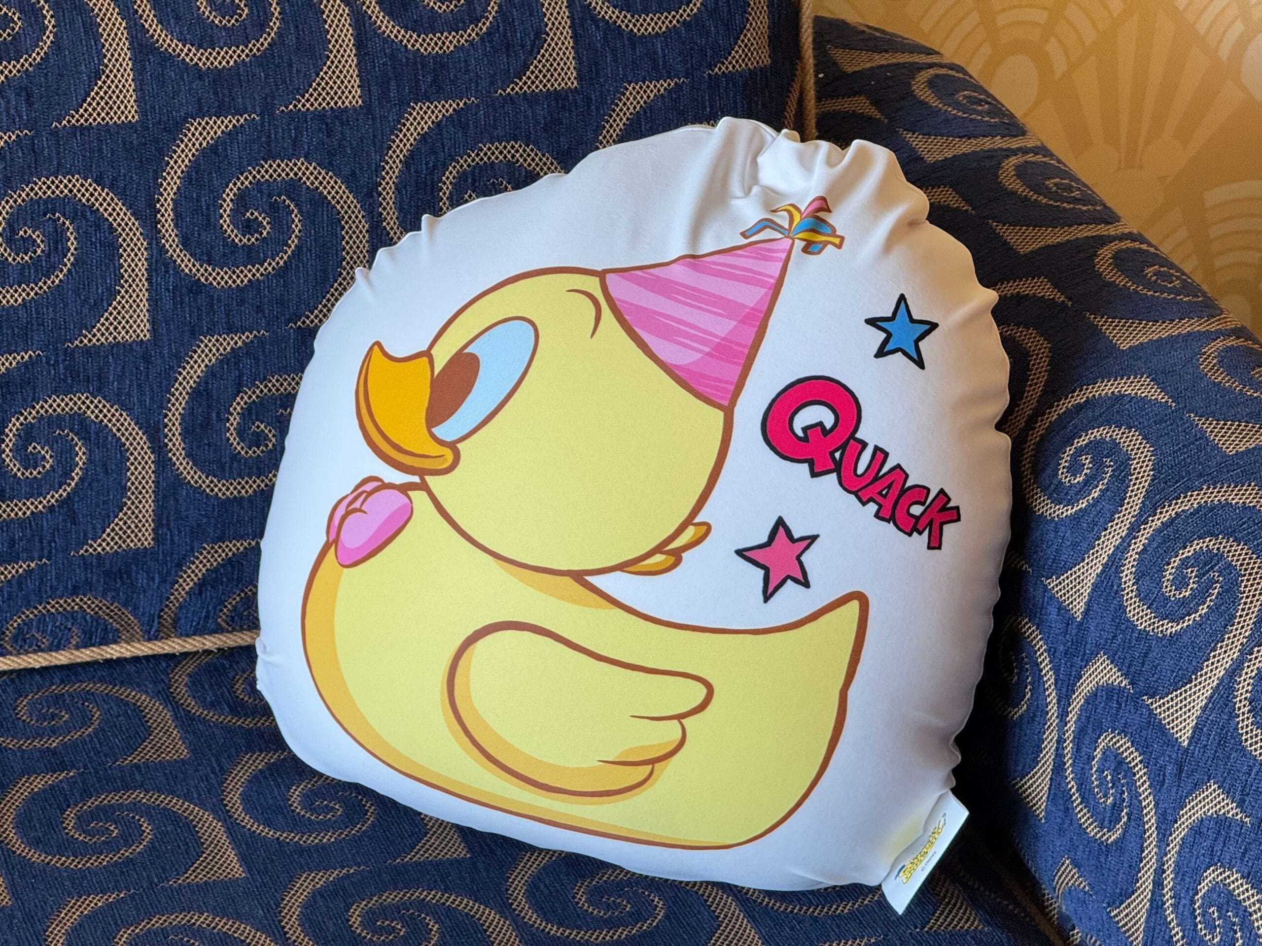 The other pillow reads “Great Duck.” On the reverse is a yellow duck in a pink party hat.