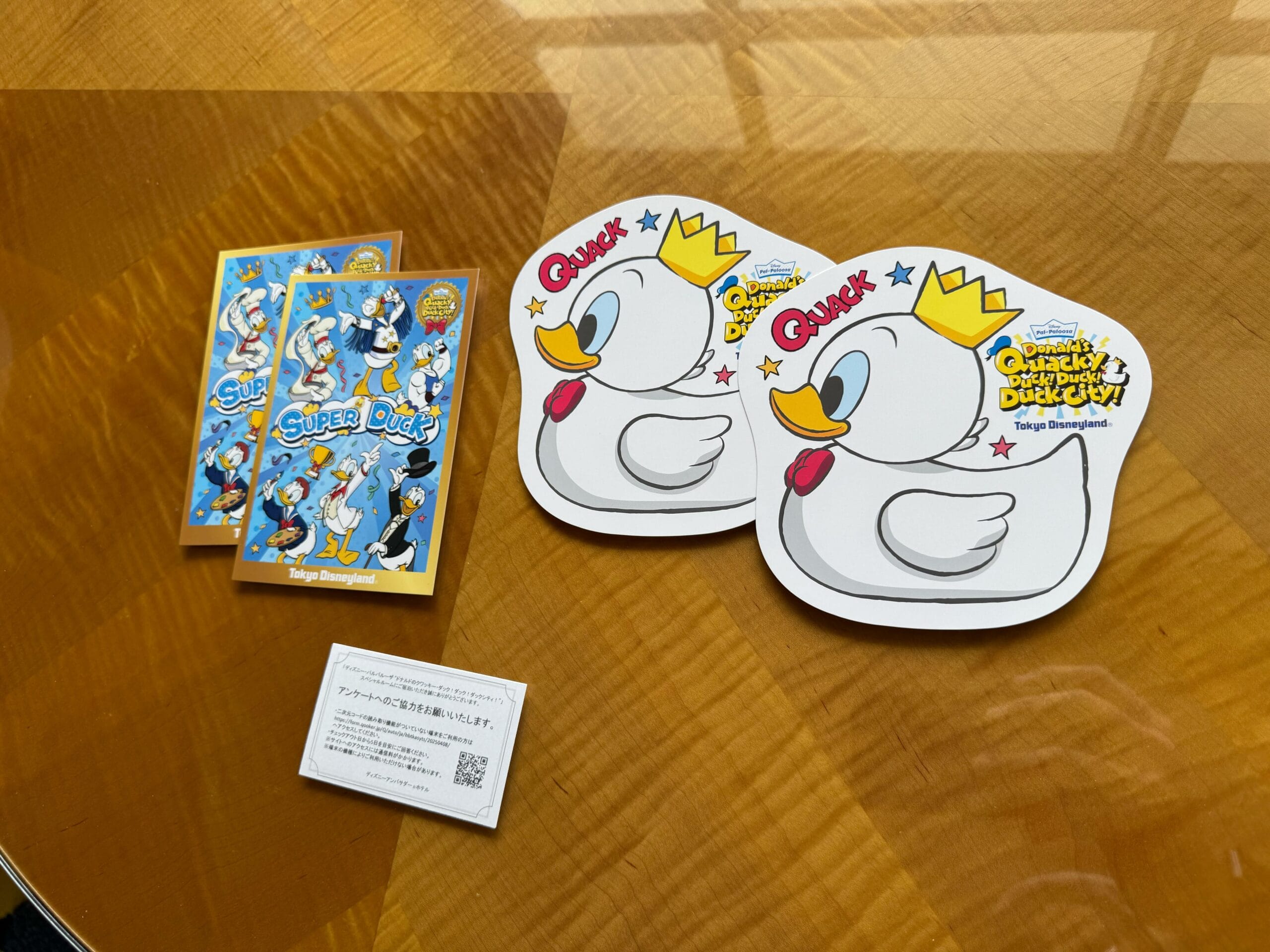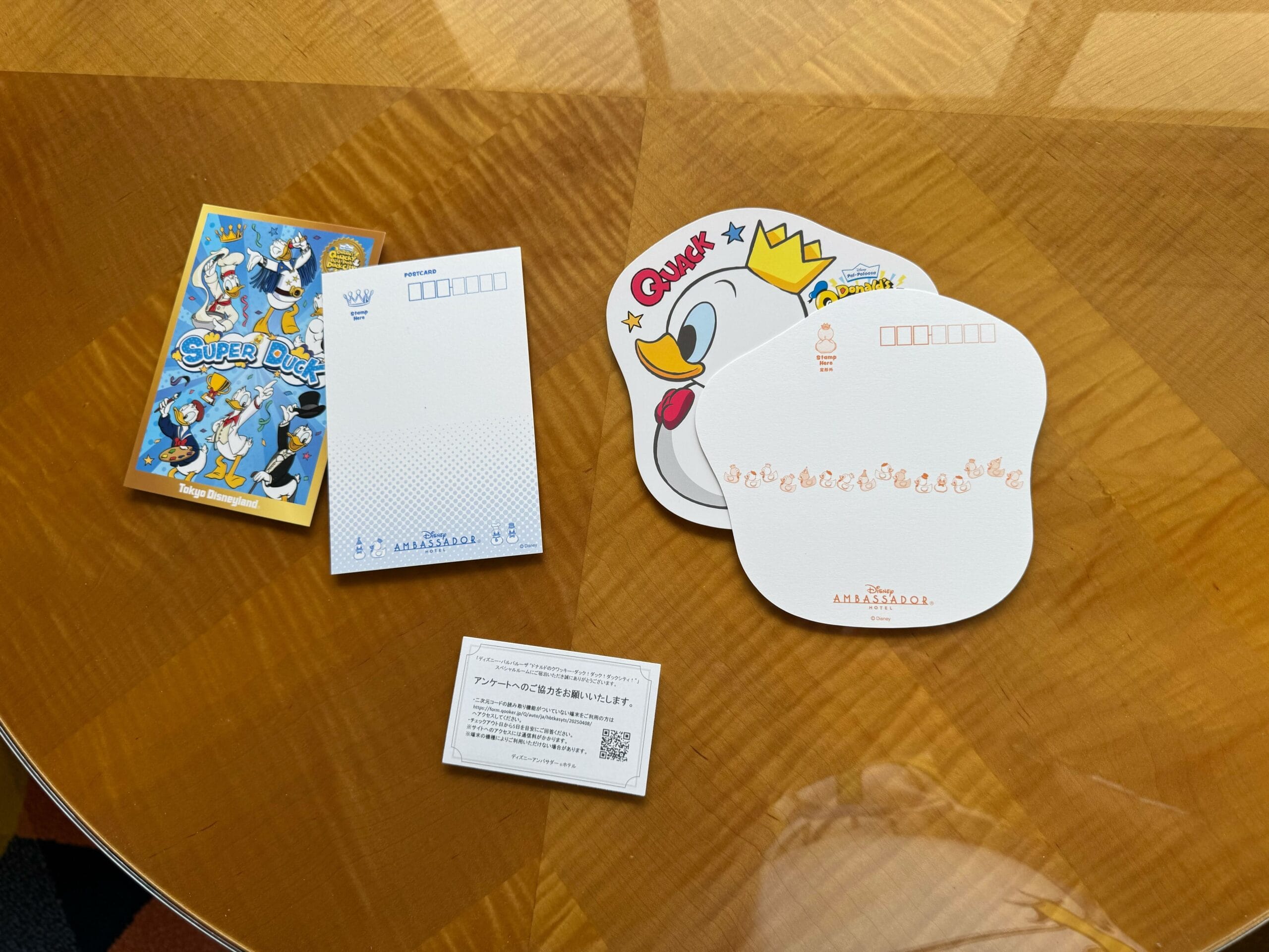 There are four Donald’s Quacky Duck! Duck! Duck City! postcards, in addition to standard Disney Ambassador Hotel postcards in the end table. Two of these are poster-style images of Donald at his different jobs. The other two are shaped like rubber ducks.
