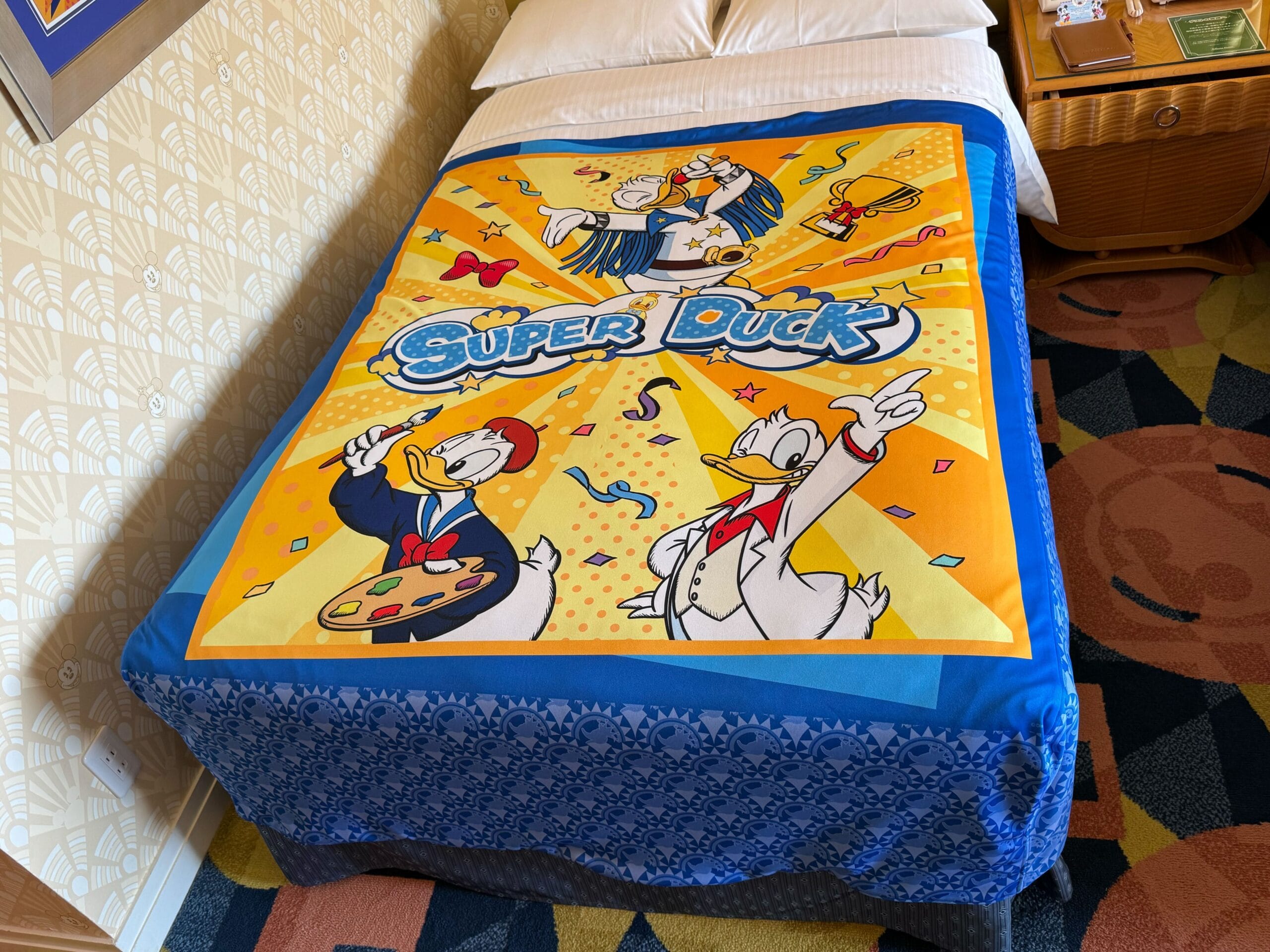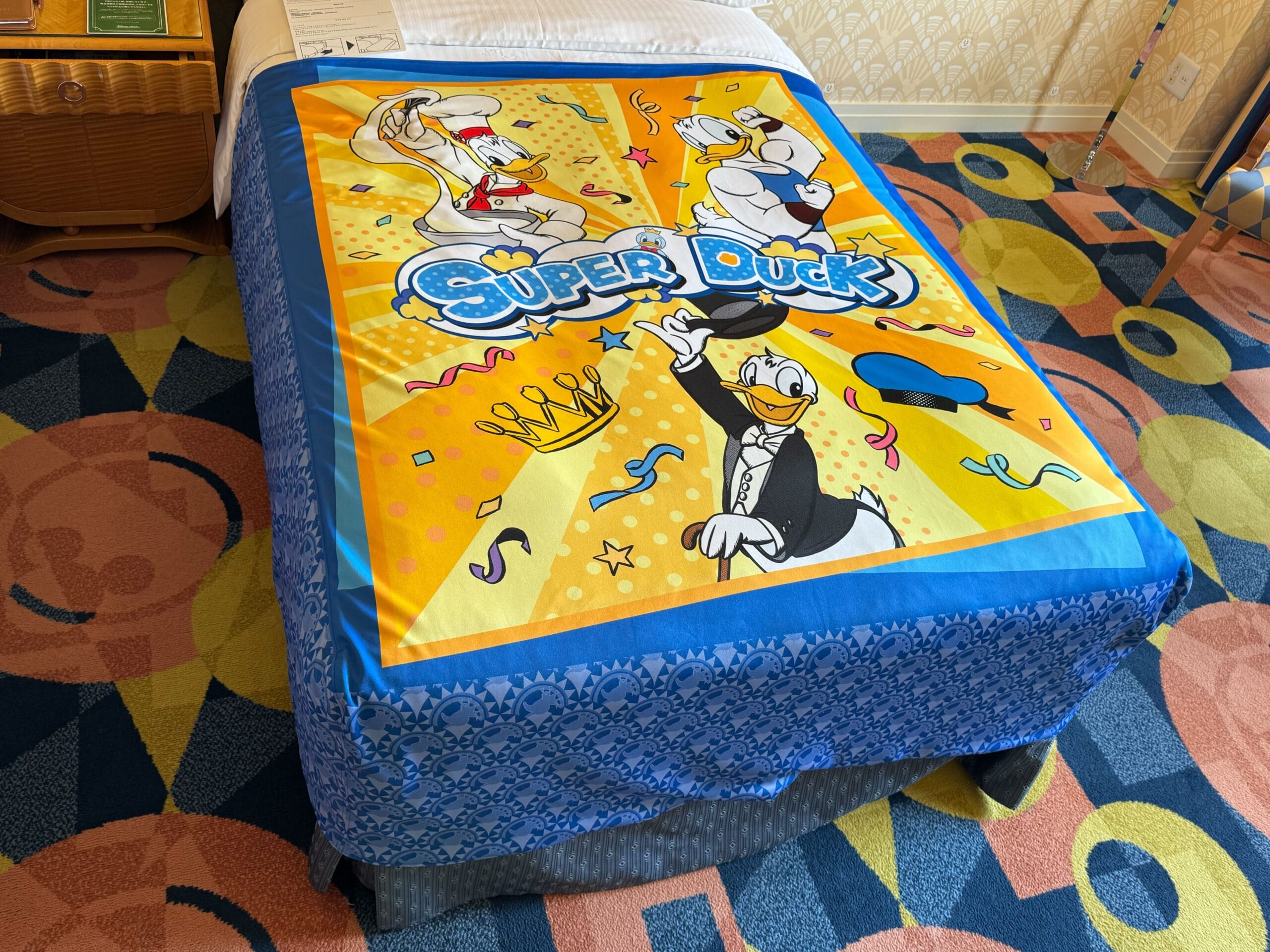 The tops of the bedspreads are yellow and orange with images of Donald in different roles around the text “Super Duck.” This one features Donald as a singer, dancer, and artist.