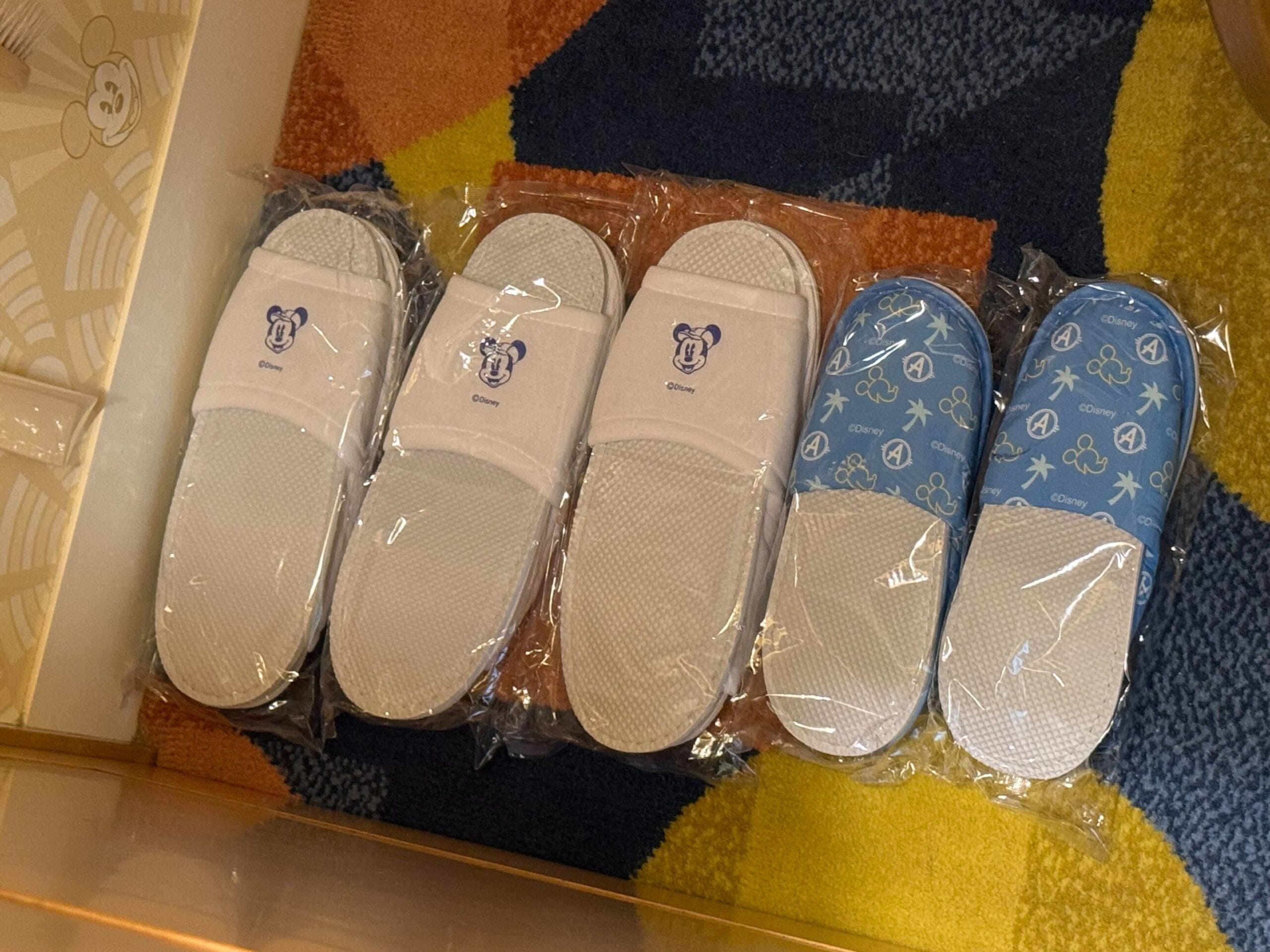 There are complimentary adult and youth slippers available. The white adult slippers feature Mickey Mouse wearing a director’s hat. The youth slippers are blue with a pattern of Mickey, Minnie, palm trees, and an “A” logo.