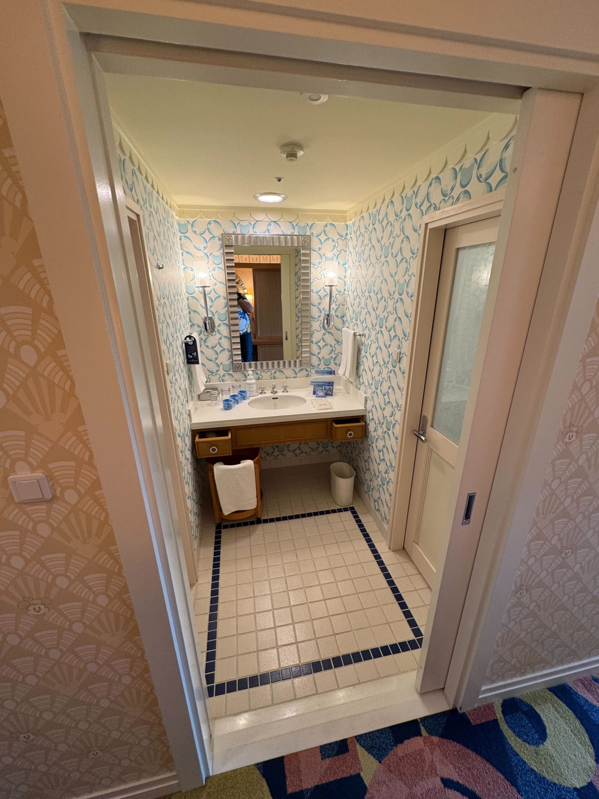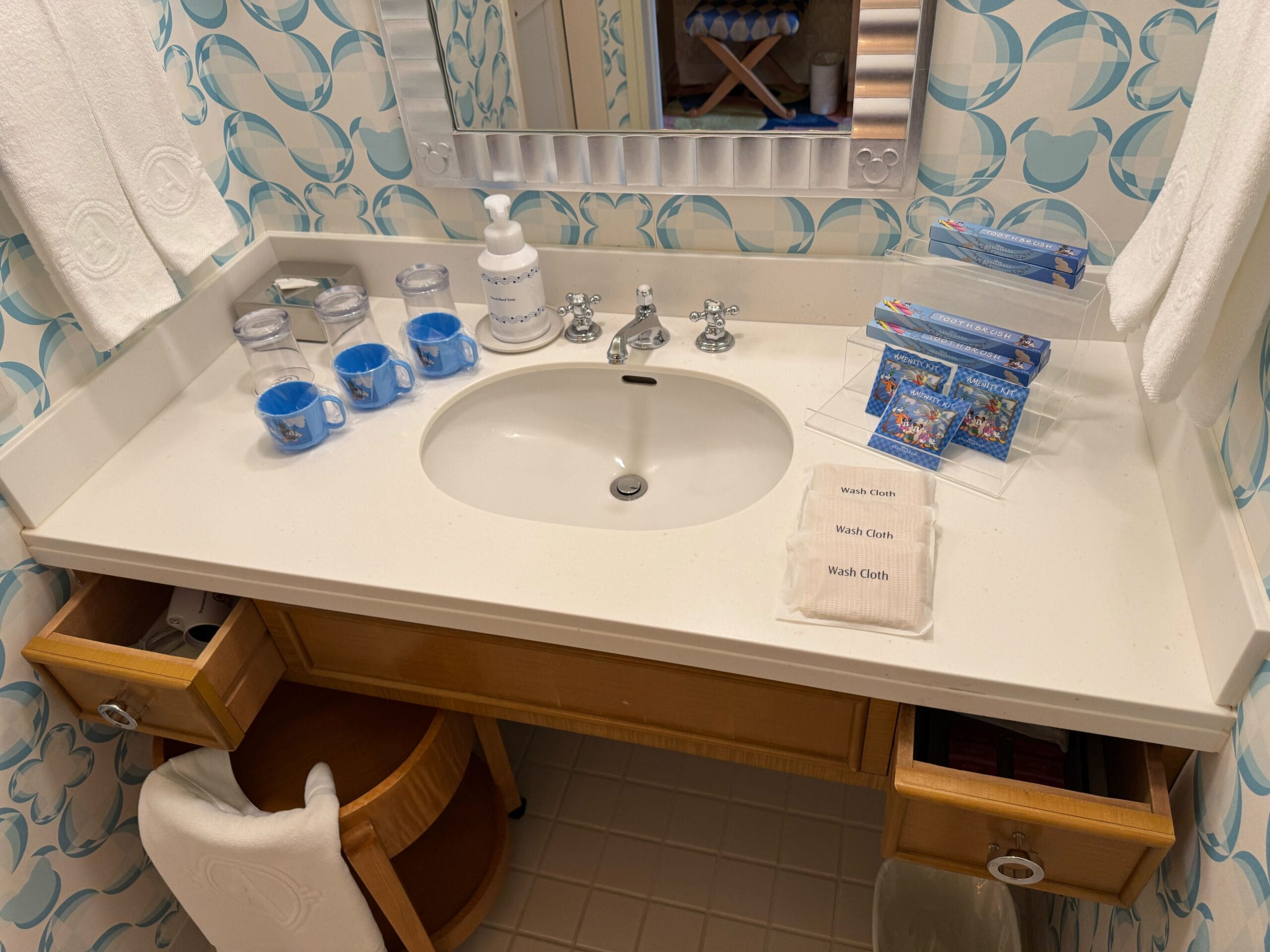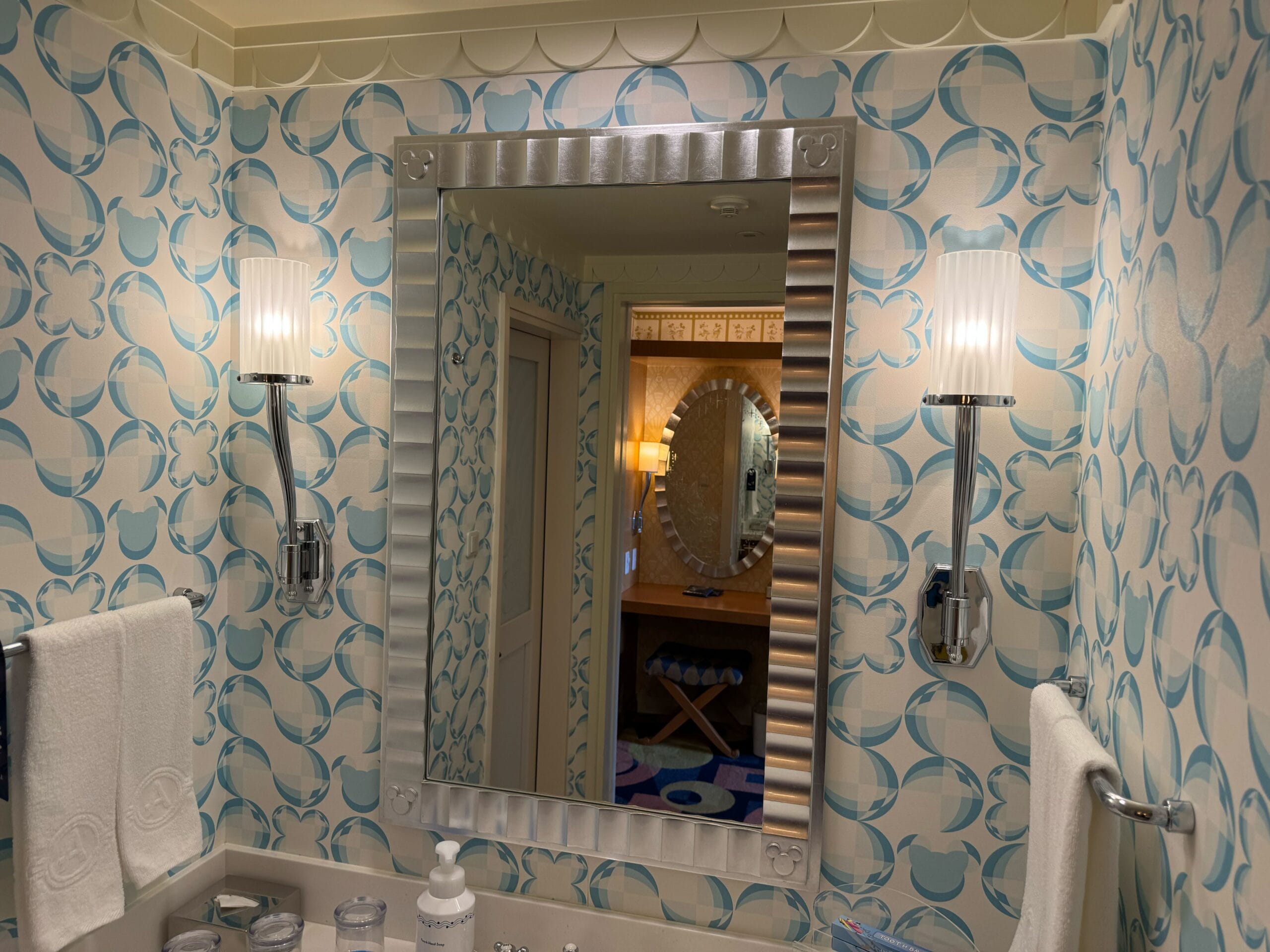 The wallpaper is white and blue with a bubble-like pattern. A silver-framed mirror featuring Mickey icons in the corners is above the vanity.