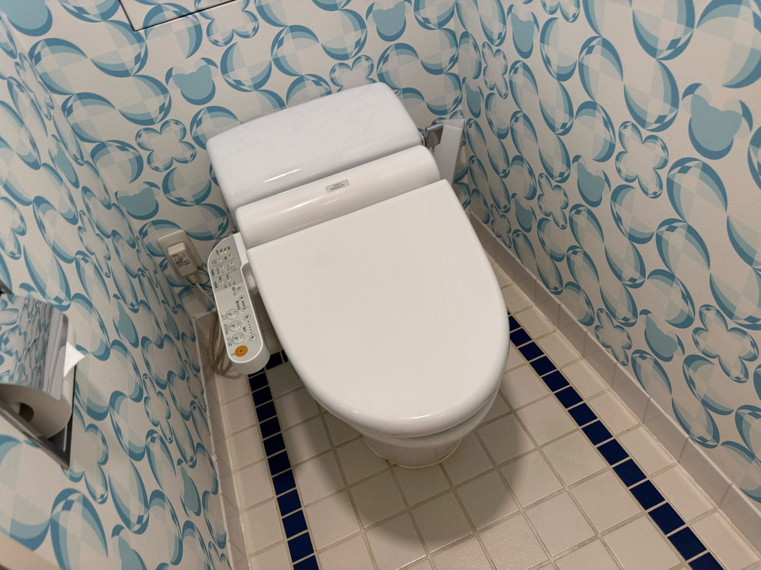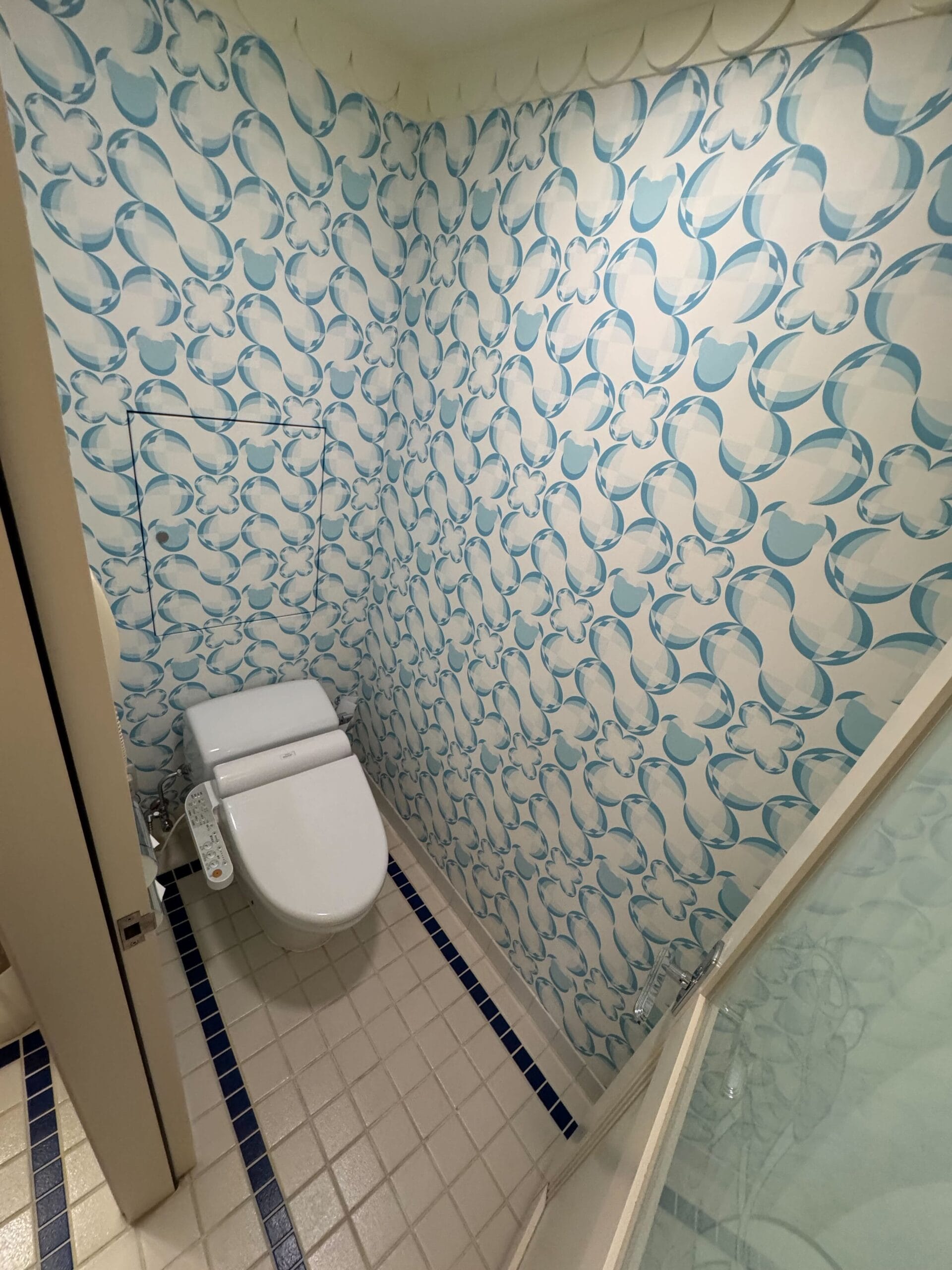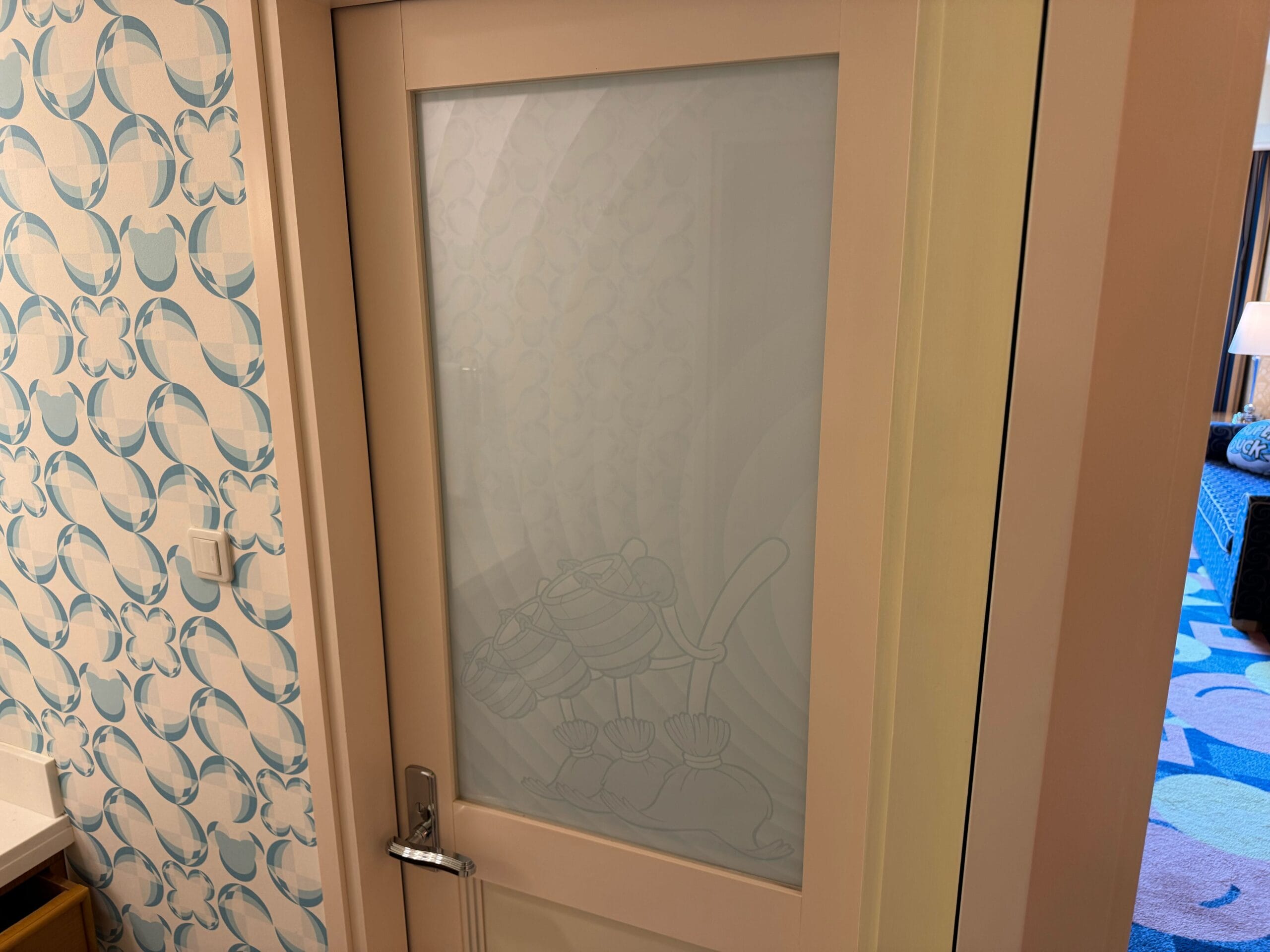 The toilet room door has an opaque window with images of the brooms from “Fantasia.” The tiles and wallpaper continue into the toilet room.