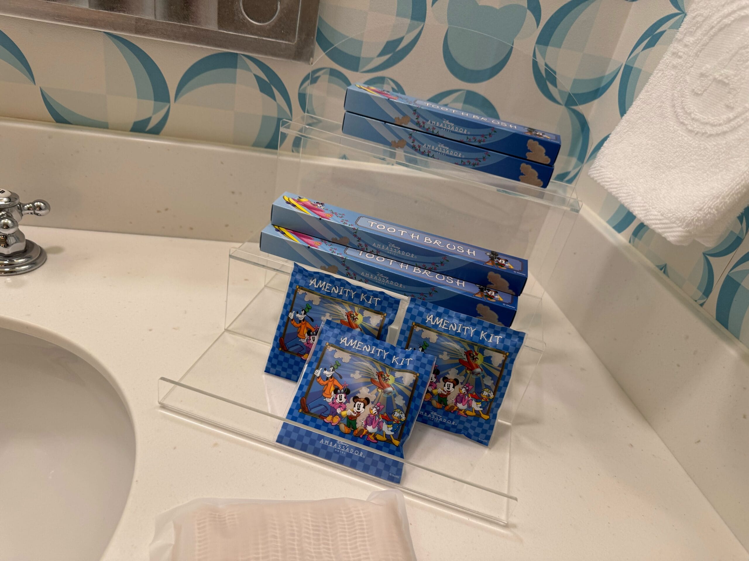 Guests can enjoy amenity kits featuring Mickey & Friends. Toothbrushes come in adult and youth sizes.