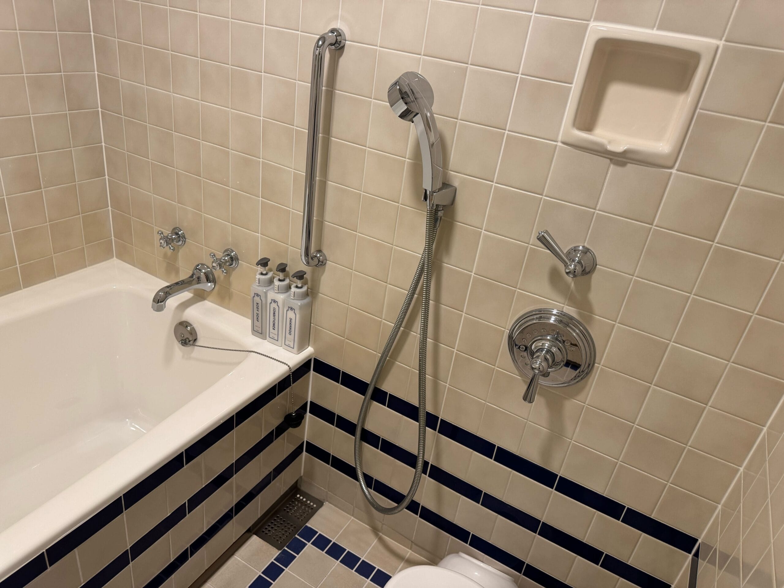 On the opposite side of the bathroom is the shower room. As is standard in Japan, the entire room is the shower, so there is no curtain and there is a drain on the floor by the tub.