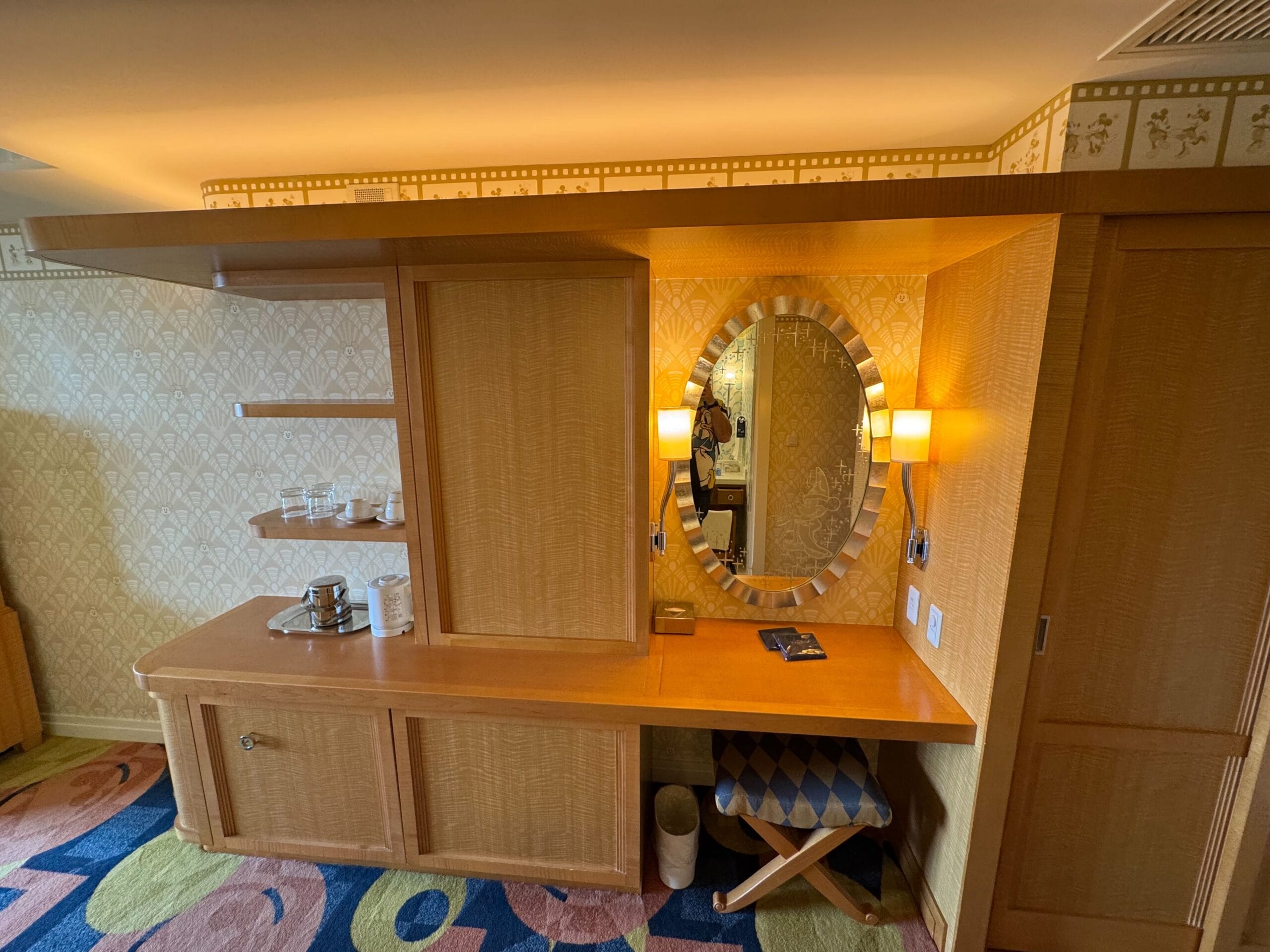 On the vanity are various free gifts exclusive to the Disney Ambassador Hotel.