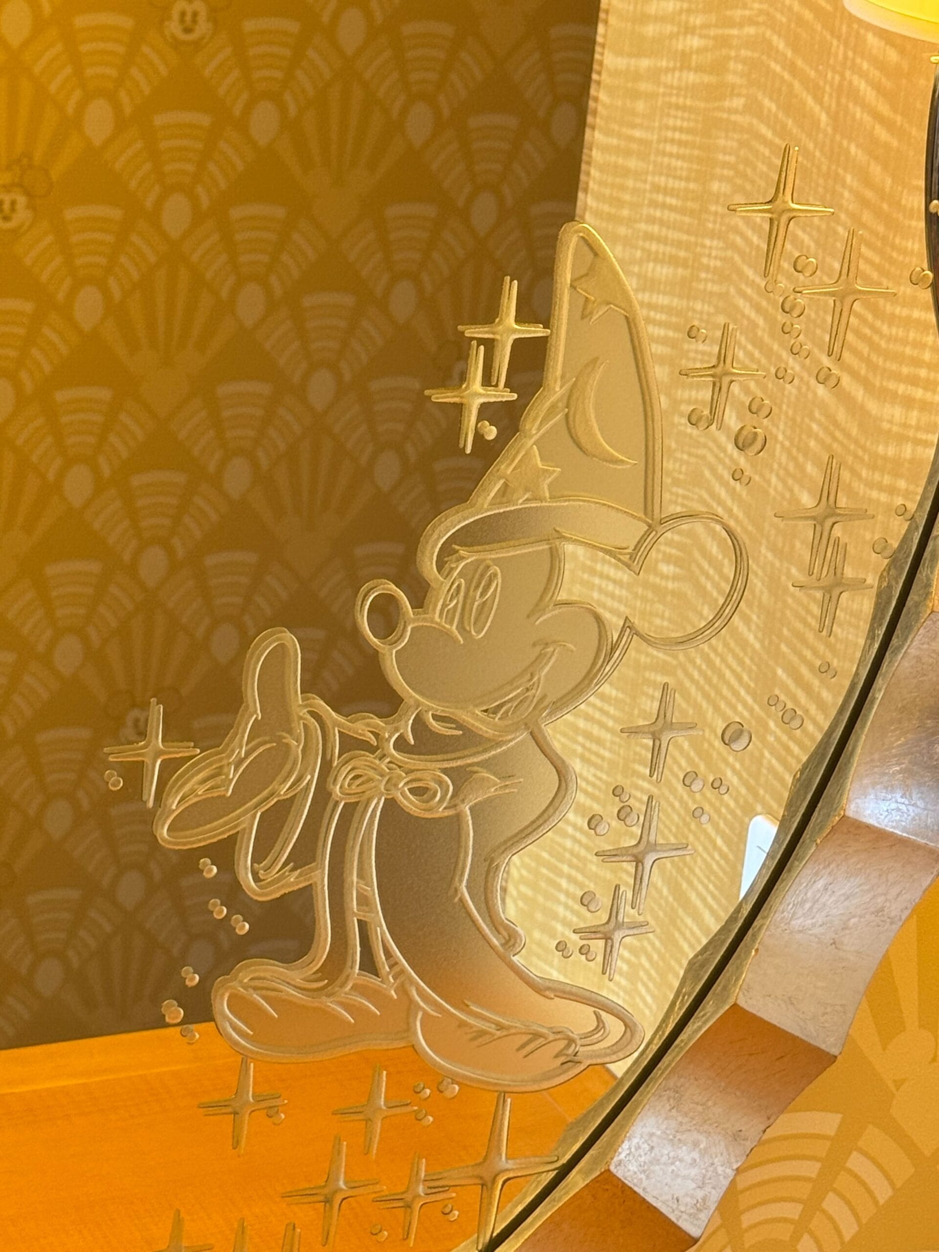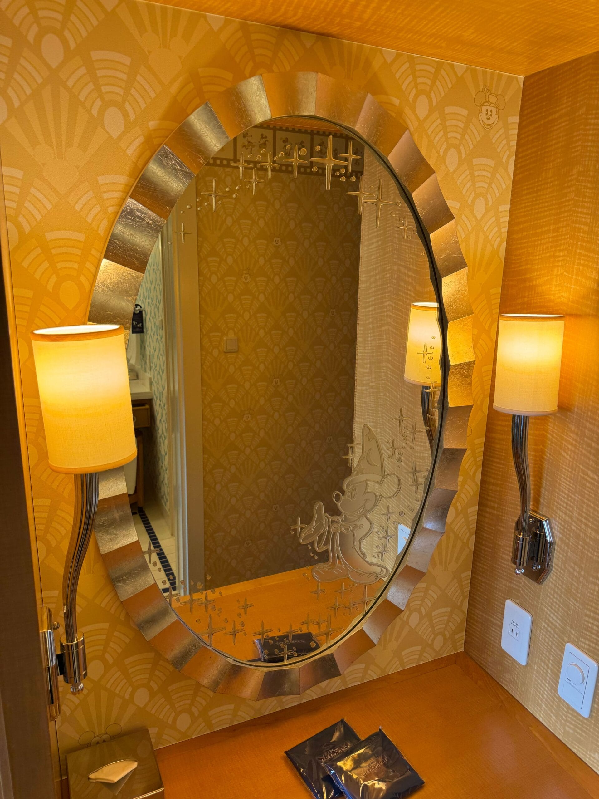 Above the vanity is an oval-shaped mirror with Sorcerer Mickey and magic sparkles etched in the glass. It’s framed by two lamps.