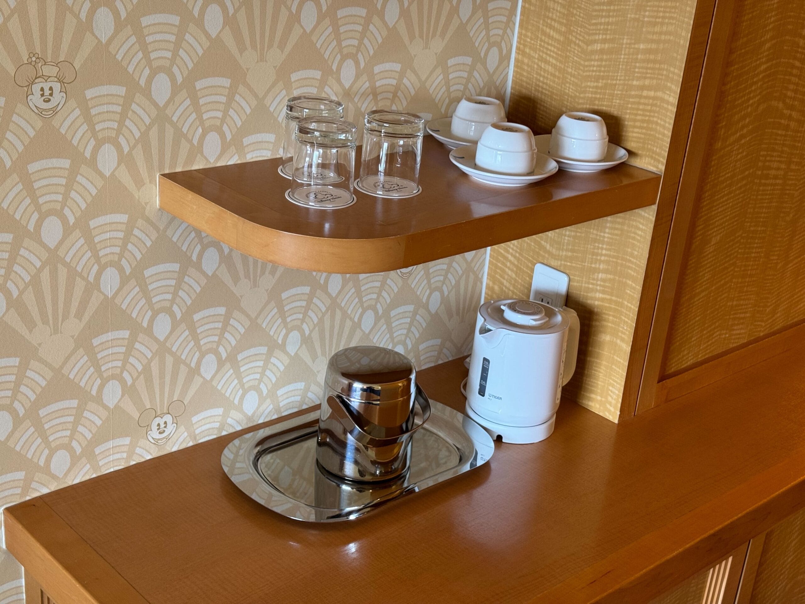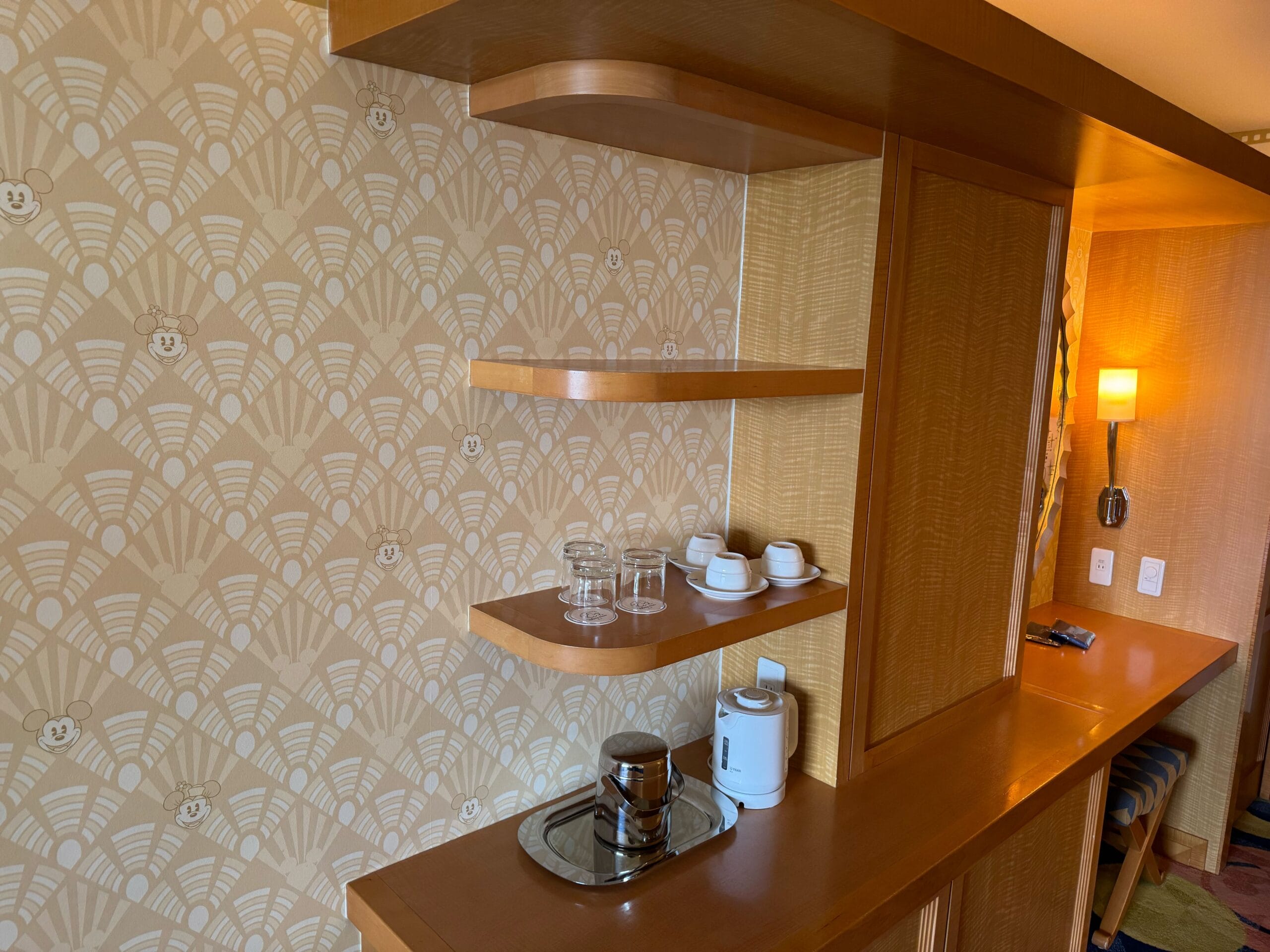 At the end of the unit are shelves. Here are glasses, coffee cups, an ice bucket, and a tea kettle. The wood block between the vanity and shelves doesn’t have a function, though it looks like it could be a cabinet.