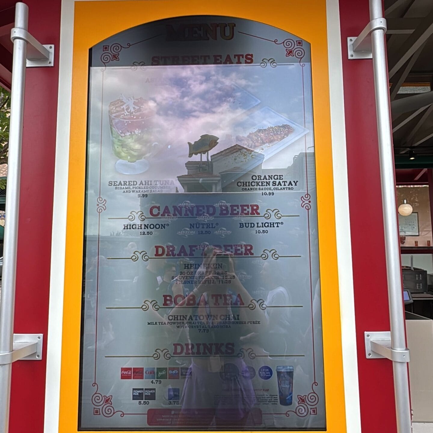 The digital screen signs Universal uses for some outdoor menus make them almost impossible to photograph in the bright Florida sun. The menu used to have two main sections for Hot Food and Chilled Food. Streetcar Snacks has now removed both of these old names and debuted one combined food section called Street Eats. The Steet Eats section includes three new menu items: