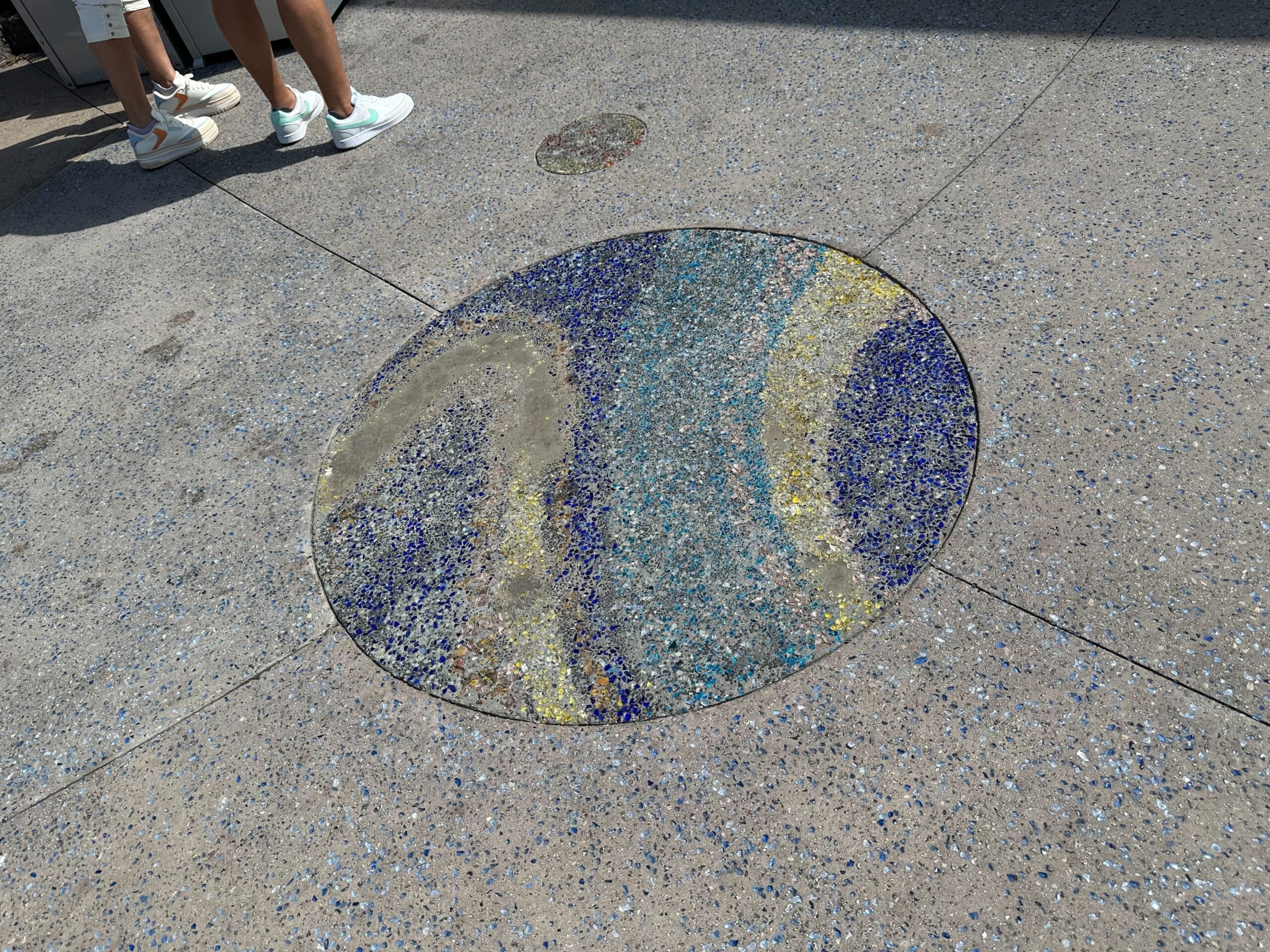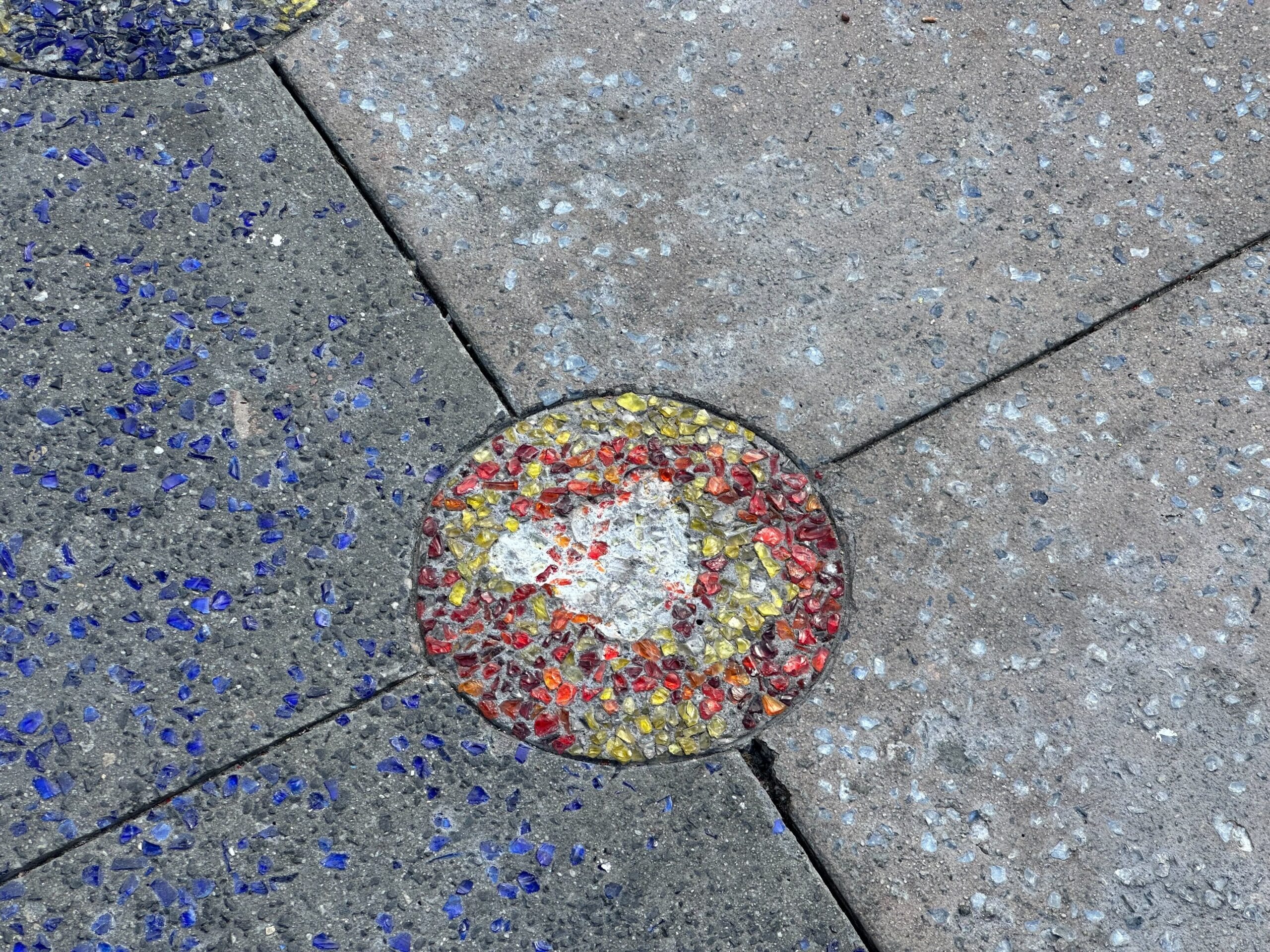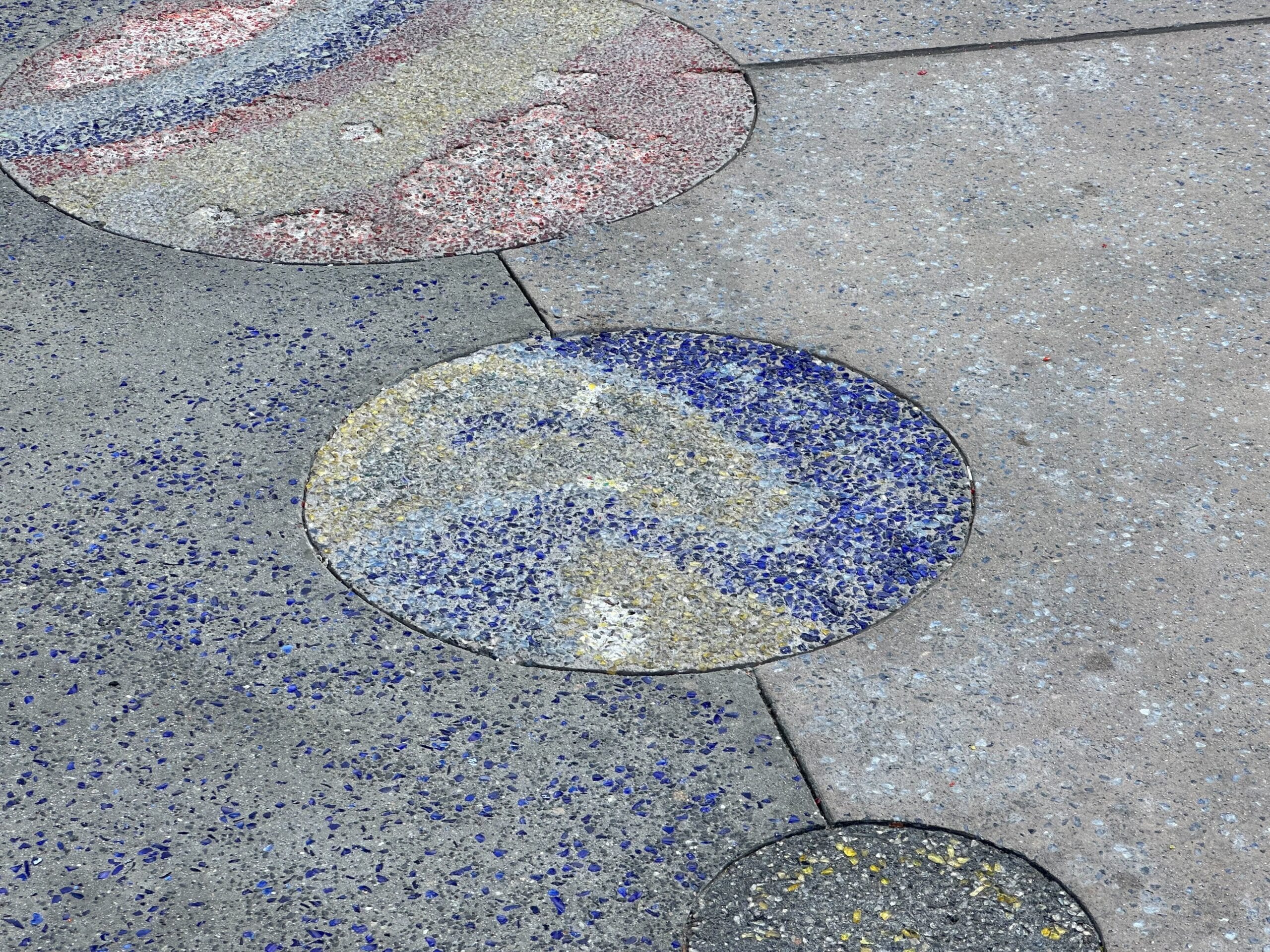Several circular patterns with colored speckles are embedded in a concrete sidewalk, featuring shades of blue, yellow, red, and gray.