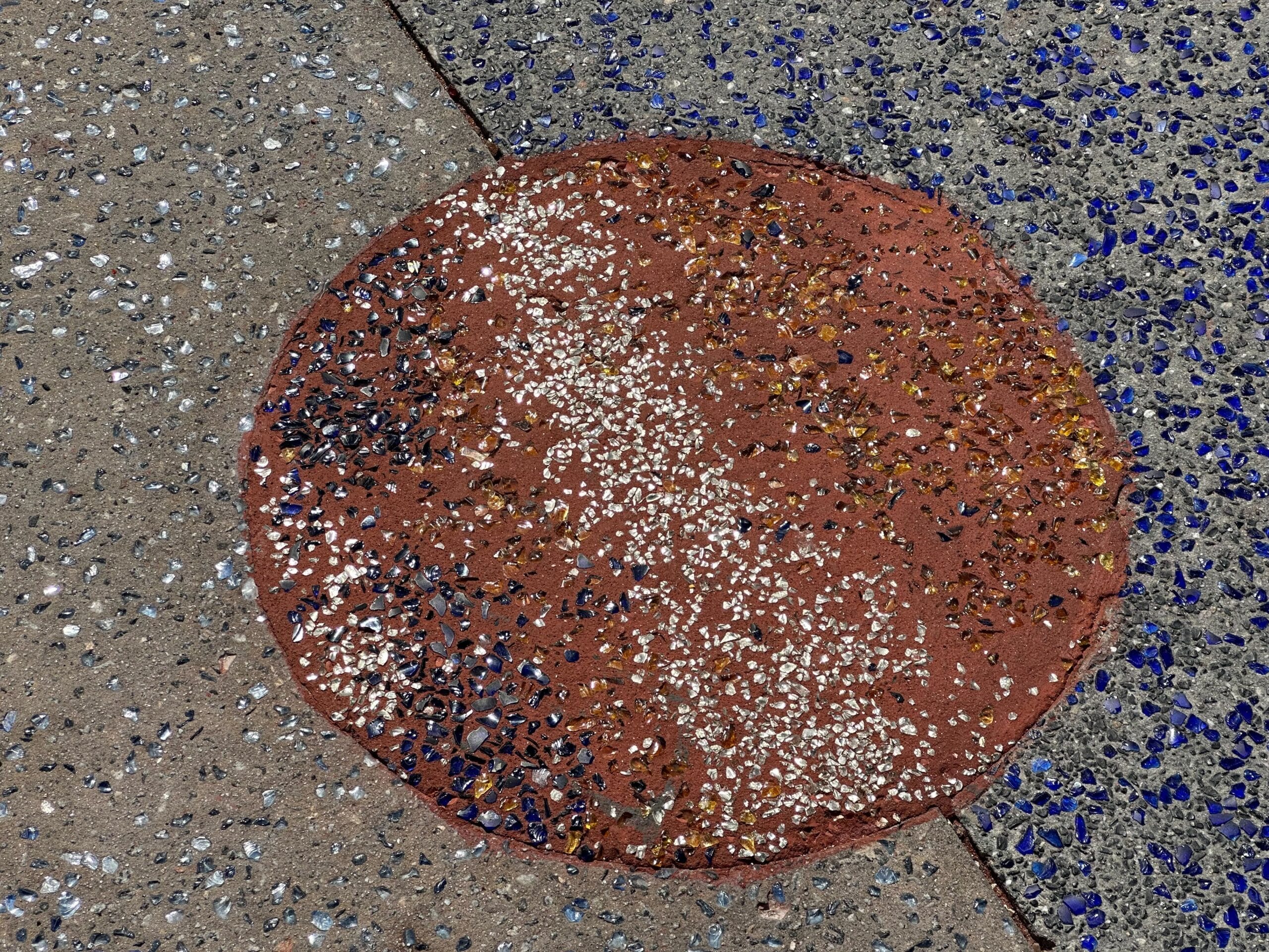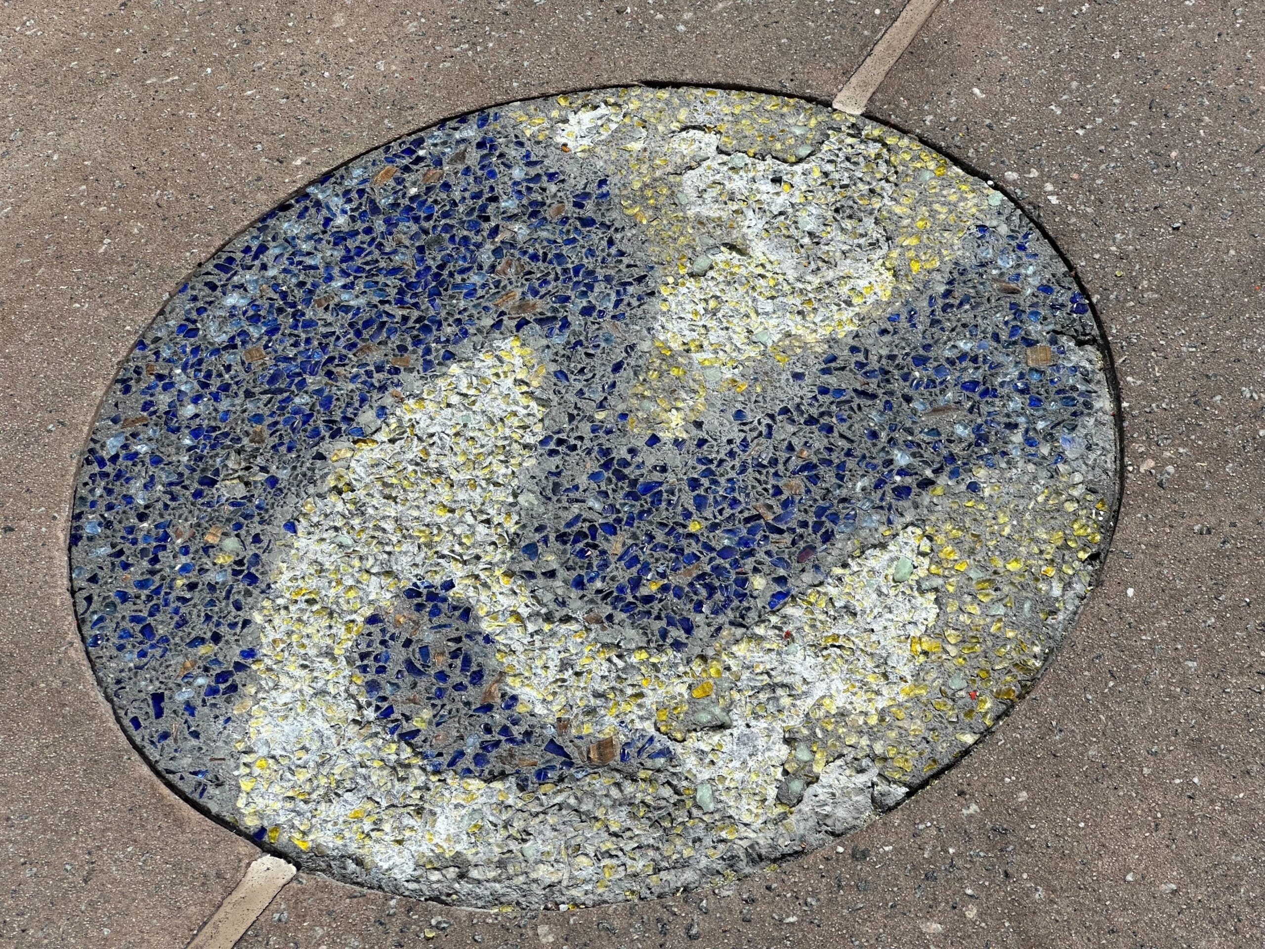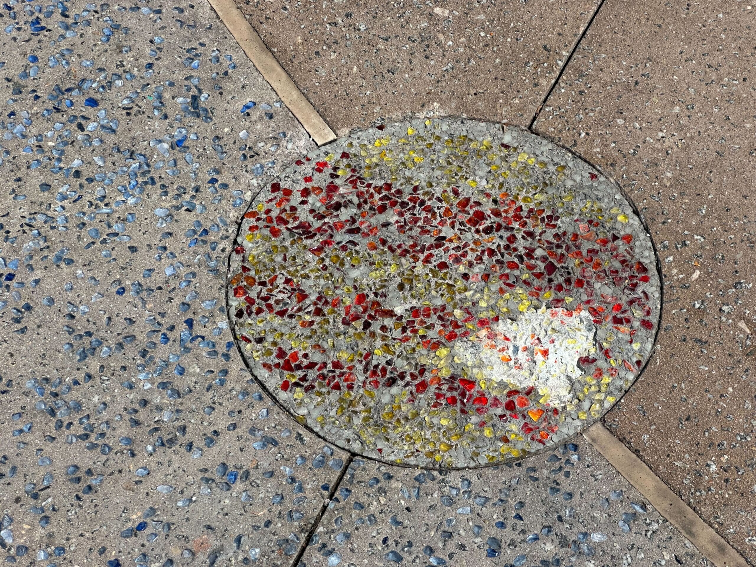 Several circular patterns with colored speckles are embedded in a concrete sidewalk, featuring shades of blue, yellow, red, and gray.