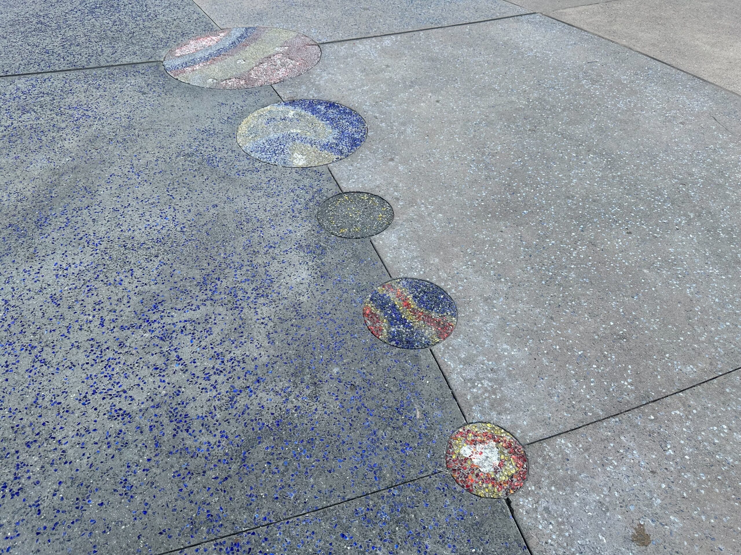 Circular mosaics resembling planets are set into a speckled concrete sidewalk, arranged in a curved line across the pavement.