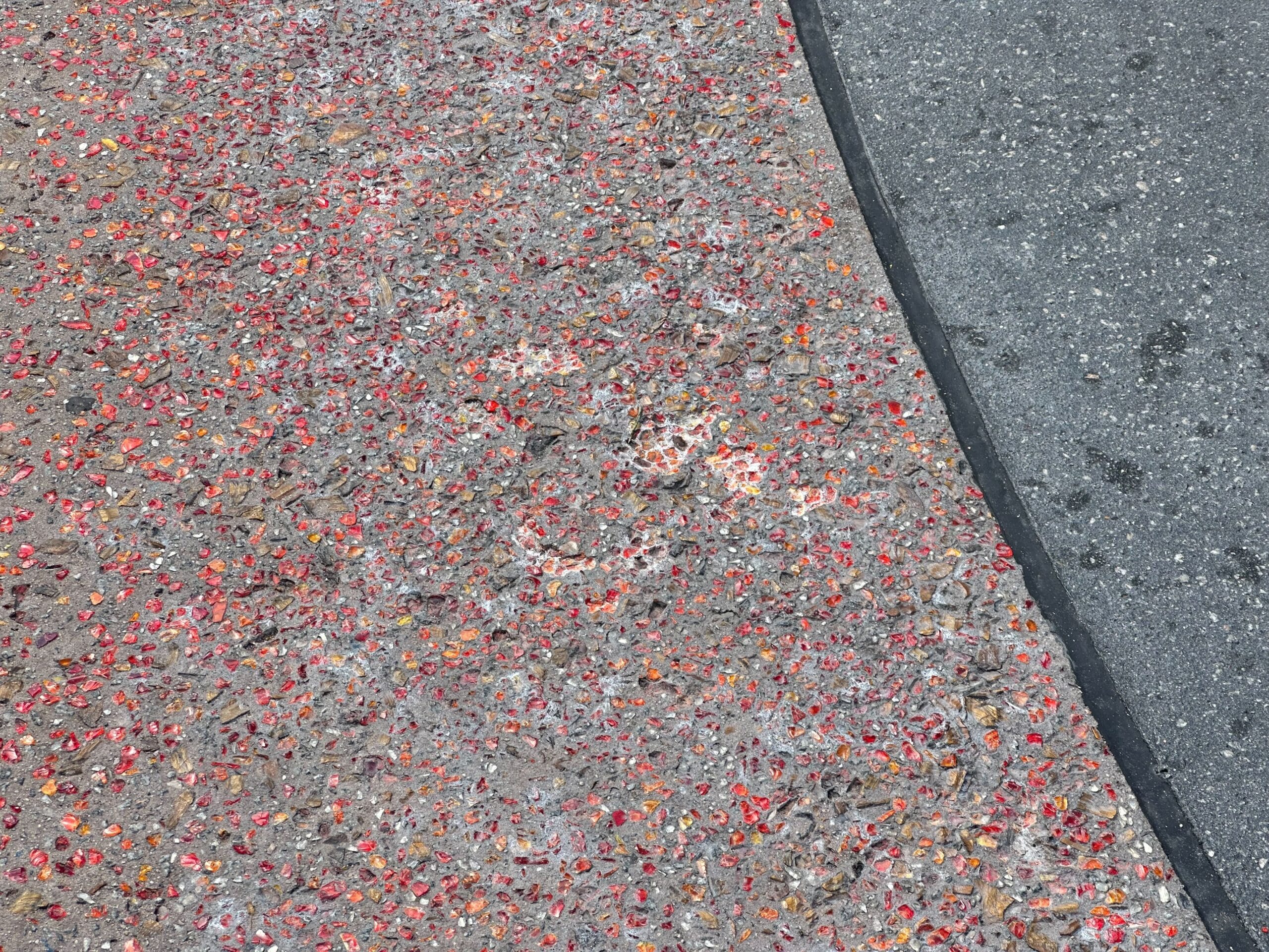 Close-up of a sidewalk covered with numerous flattened, colorful pieces of chewing gum next to an asphalt road with a visible curb.