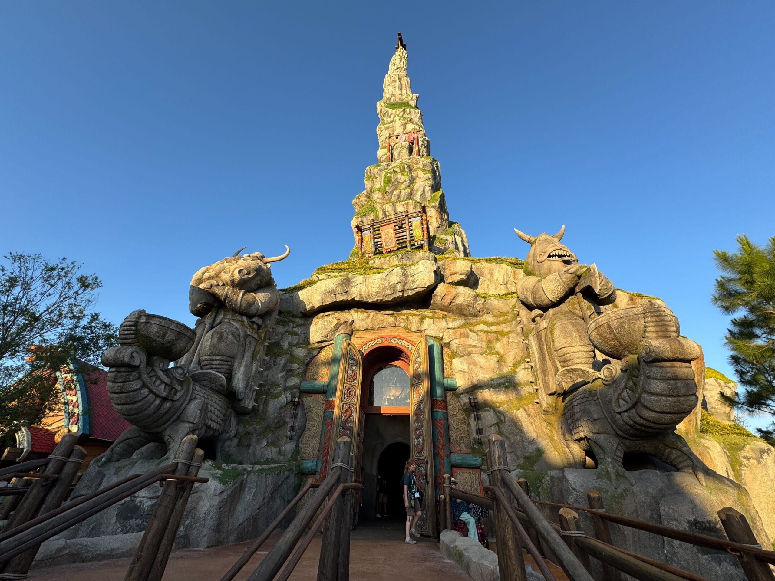 Entrance to a Mead Hall with two large warrior statues and a tall, rocky spire under a clear blue sky.