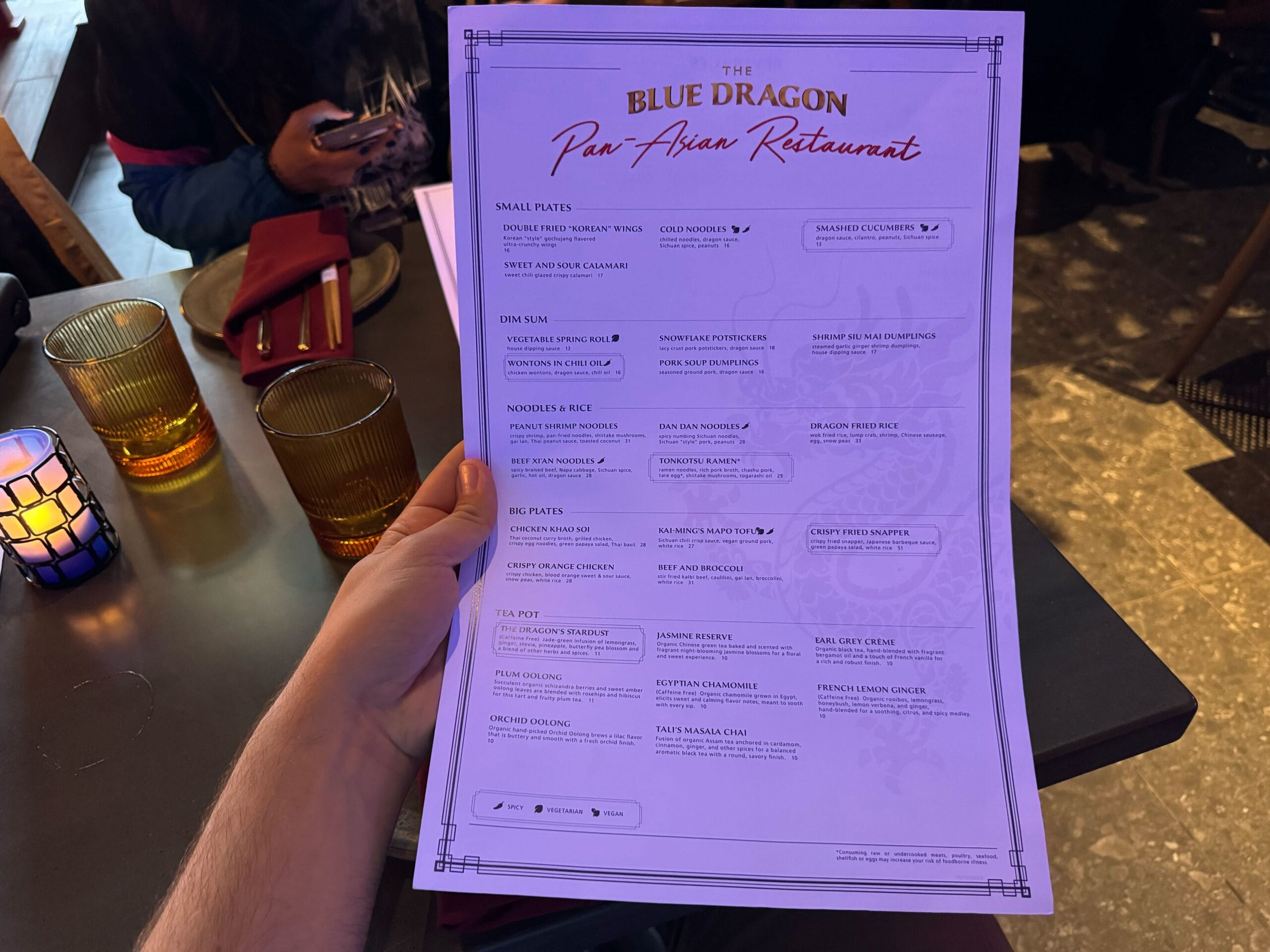 See the full menus with prices for The Blue Dragon Pan-Asian Restaurant, a full-service restaurant in Celestial Park at Epic Universe.