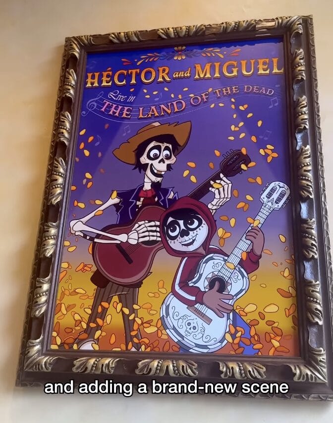 Moriarty’s Instagram video included a peek at a poster for the scene in the ride’s queue. In the scene, Héctor and Miguel perform “Un Poco Loco” in the Land of the Dead. Instead of replacing another scene, the “Coco” scene is slotted between “The Lion King” and “Peter Pan” sections, adding about 2 minutes to the show.