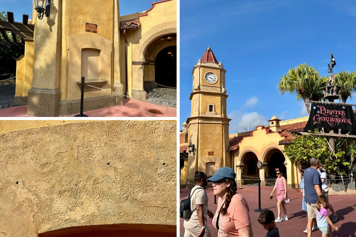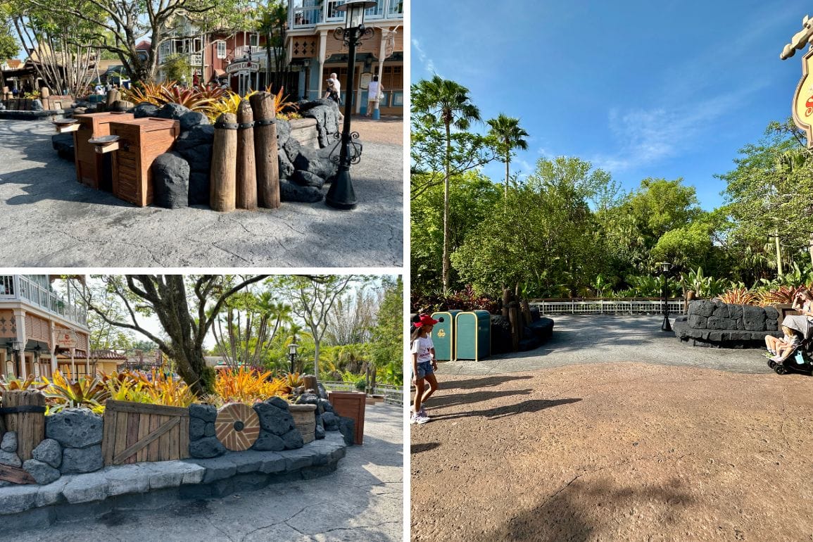 Adventureland in Magic Kingdom has been making some serious land upgrades and refurbishments. The rock work in this area just before the treehouse has been in the process of being painted a darker color gray. This gives the rocks more of a lava rock look and differentiates the rocks from the grey concrete. I like it.