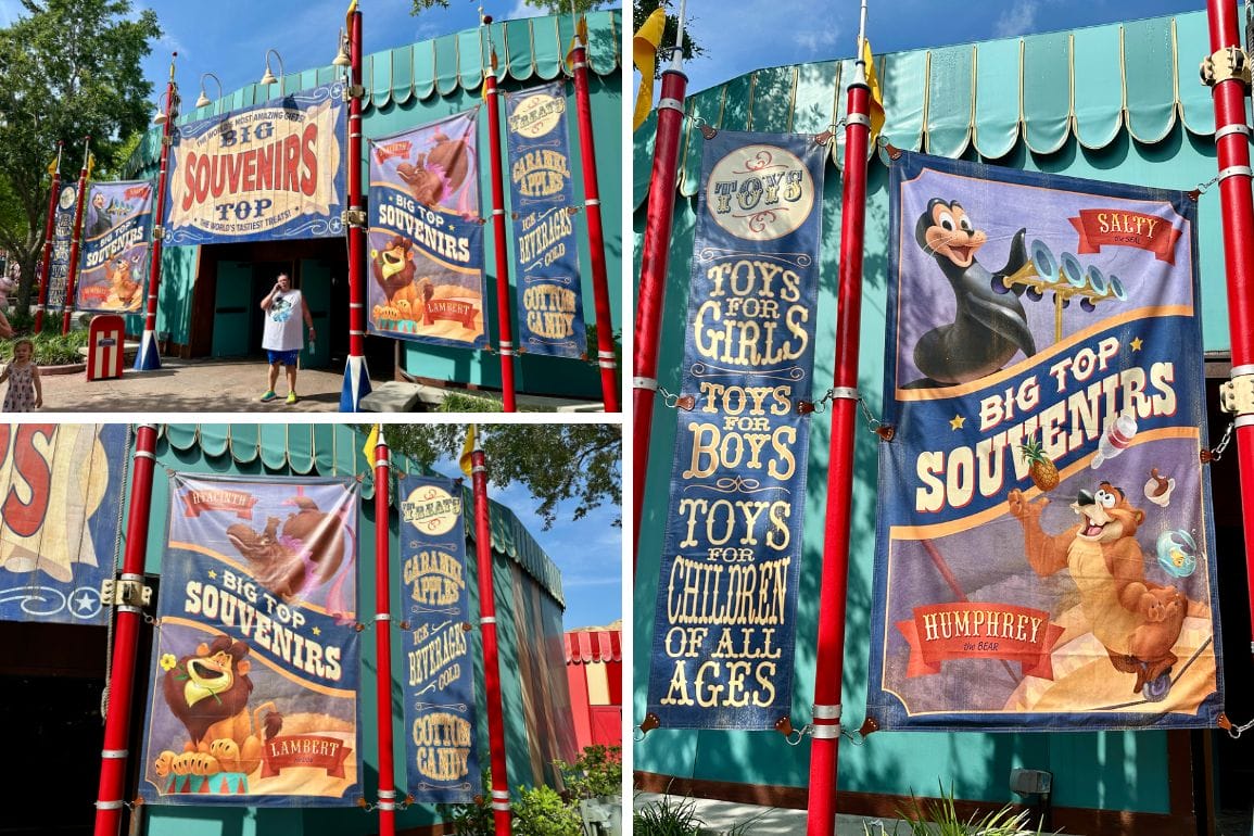 Big Top Souvenirs in Storybook Circus got new banners since my last visit. You can still see the creases from where the banners were folded for transport. I missed these brightly colored old-style circus banners. Lately they have been a bit bleached-out by the sun. It can get brutal out here in Florida. Any deep colors don’t last very long, it seems.