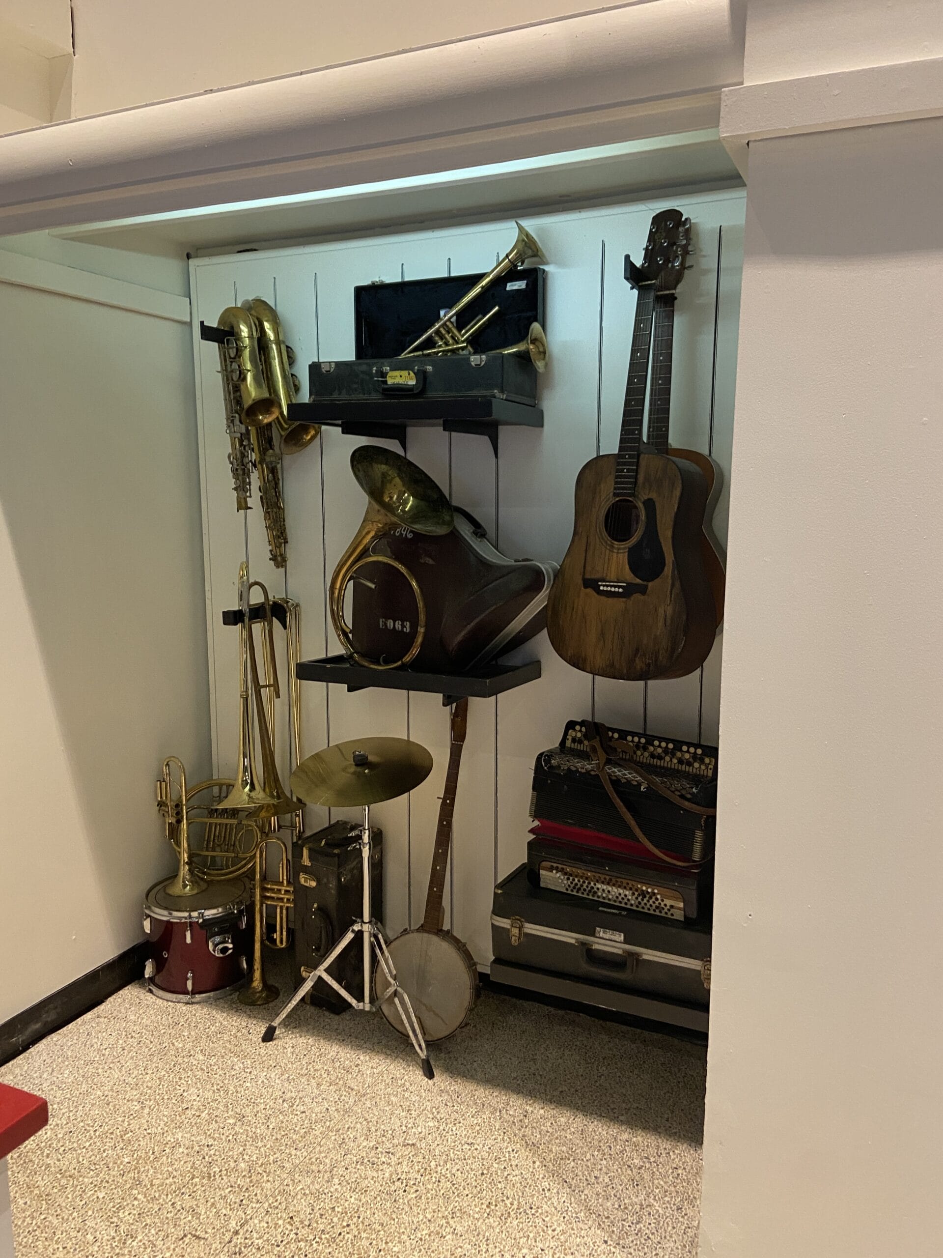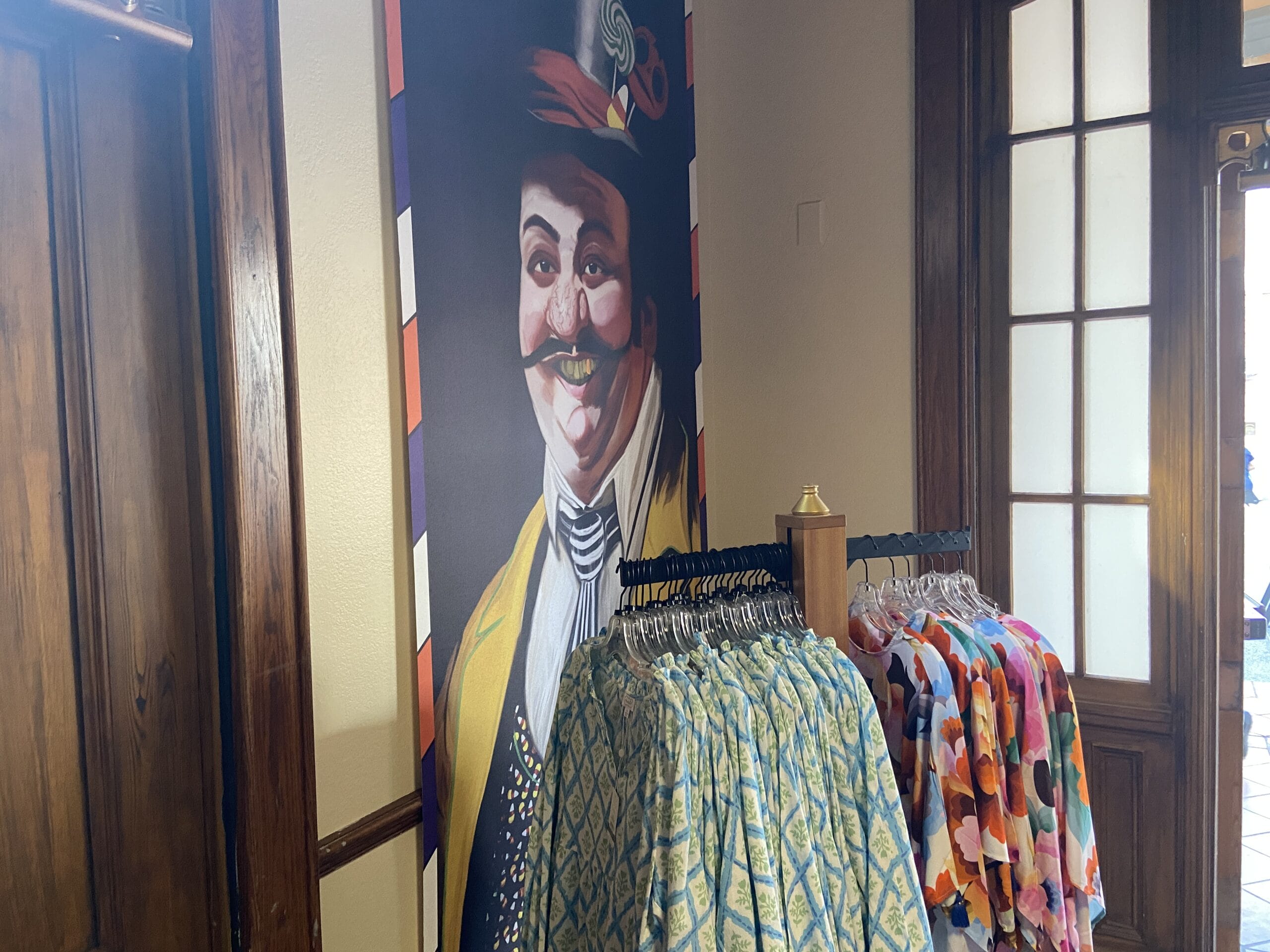 Behind one set of checkout counters are instruments, seemingly from the Mardi Gras Tribute Store.