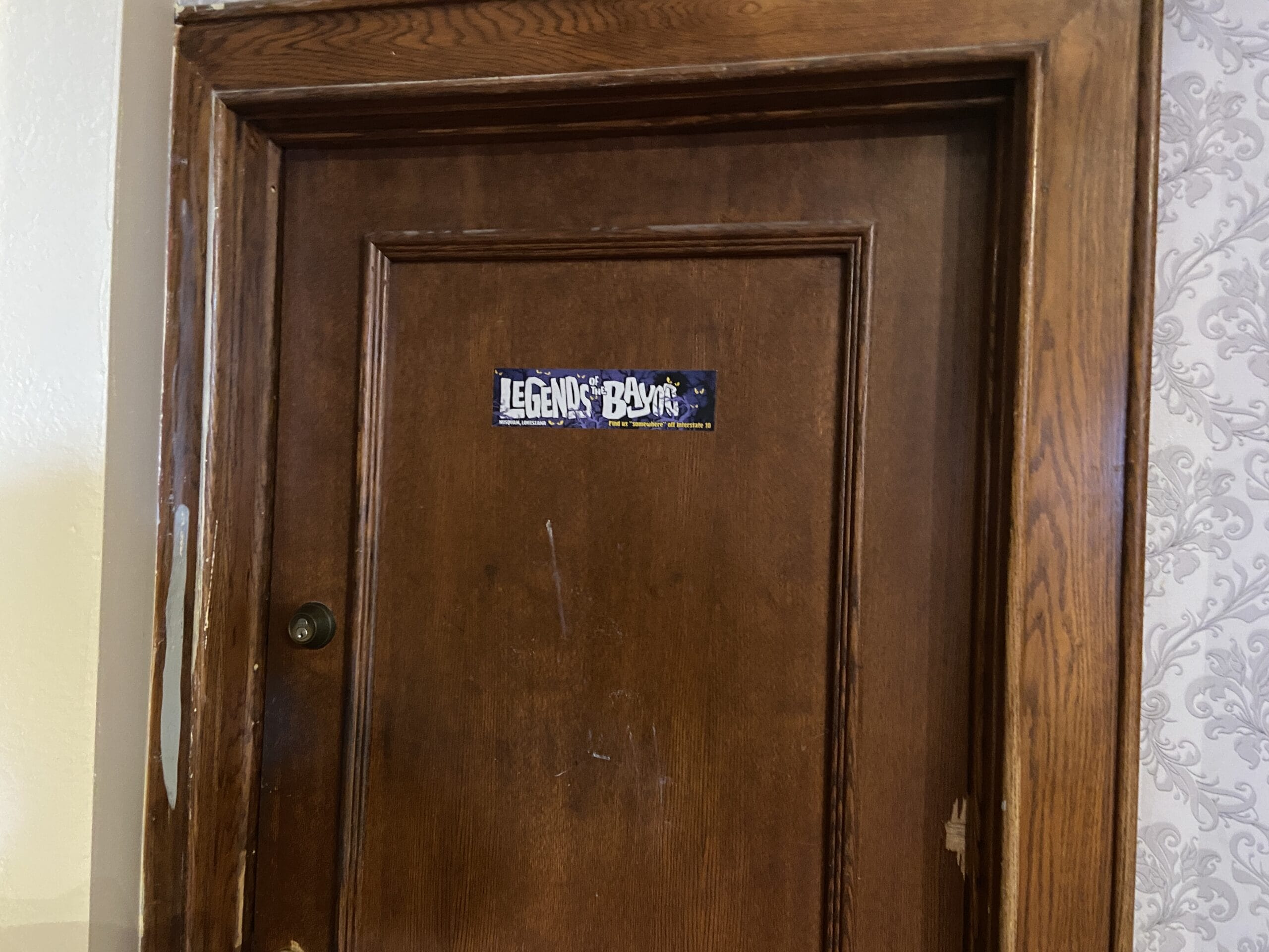 This door has a Legends of the Bayou bumper sticker on it from the most recent Mardi Gras Tribute Store, which was in this same location.