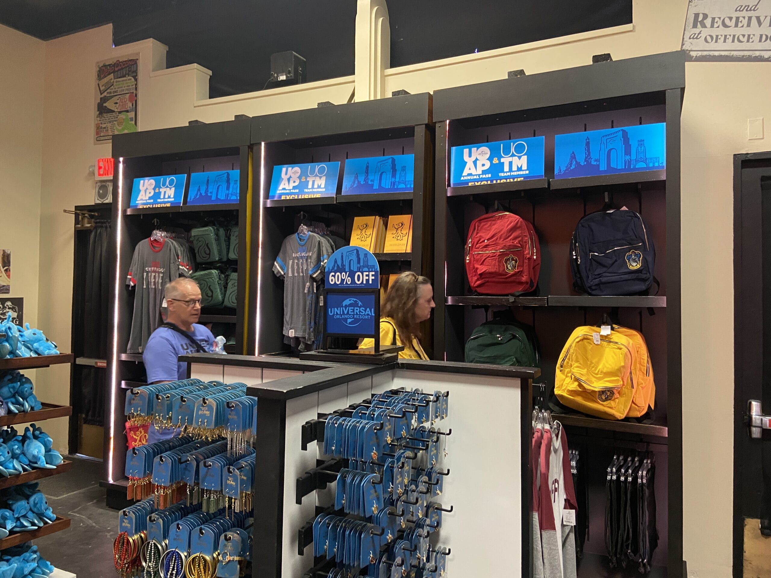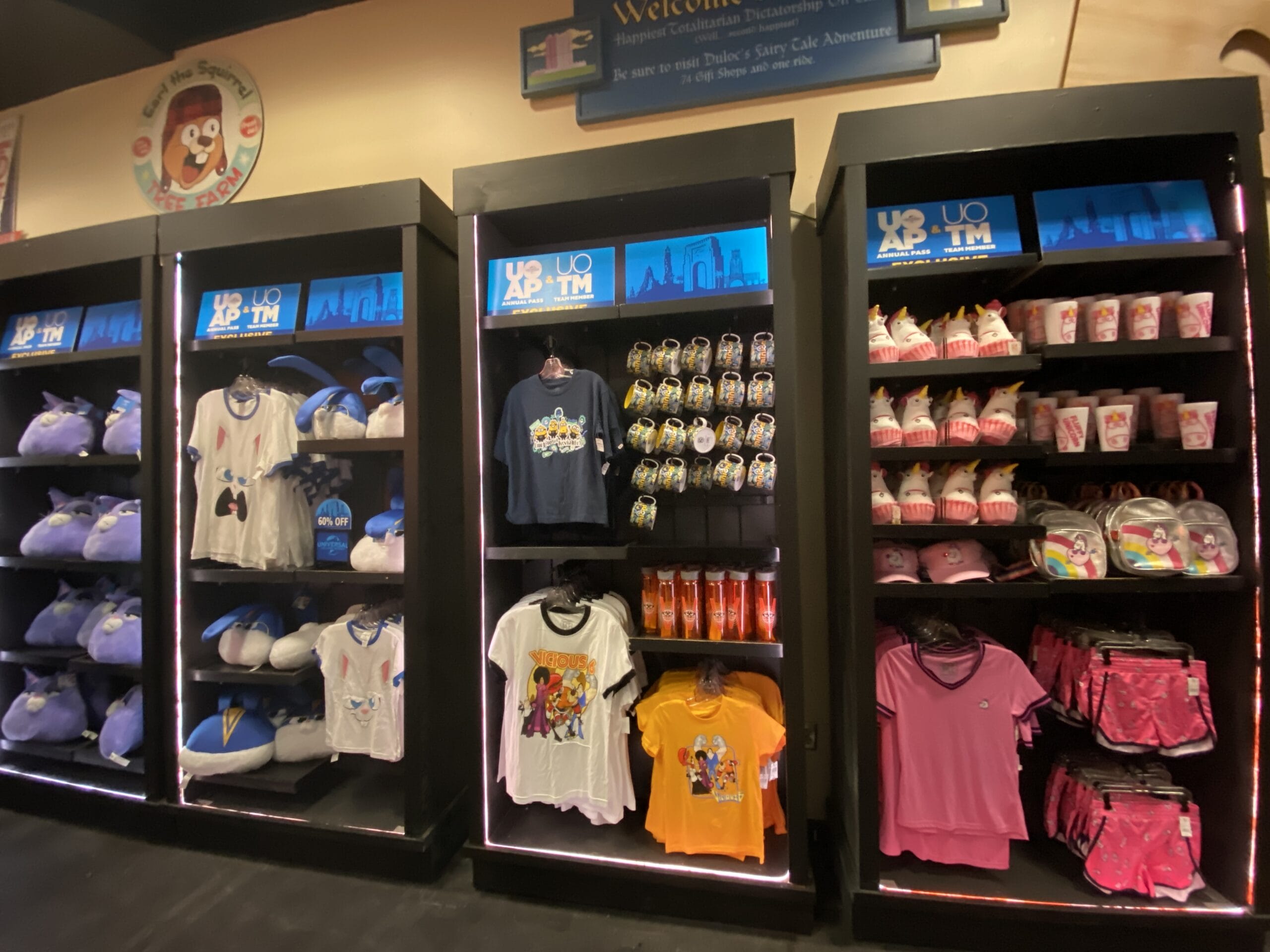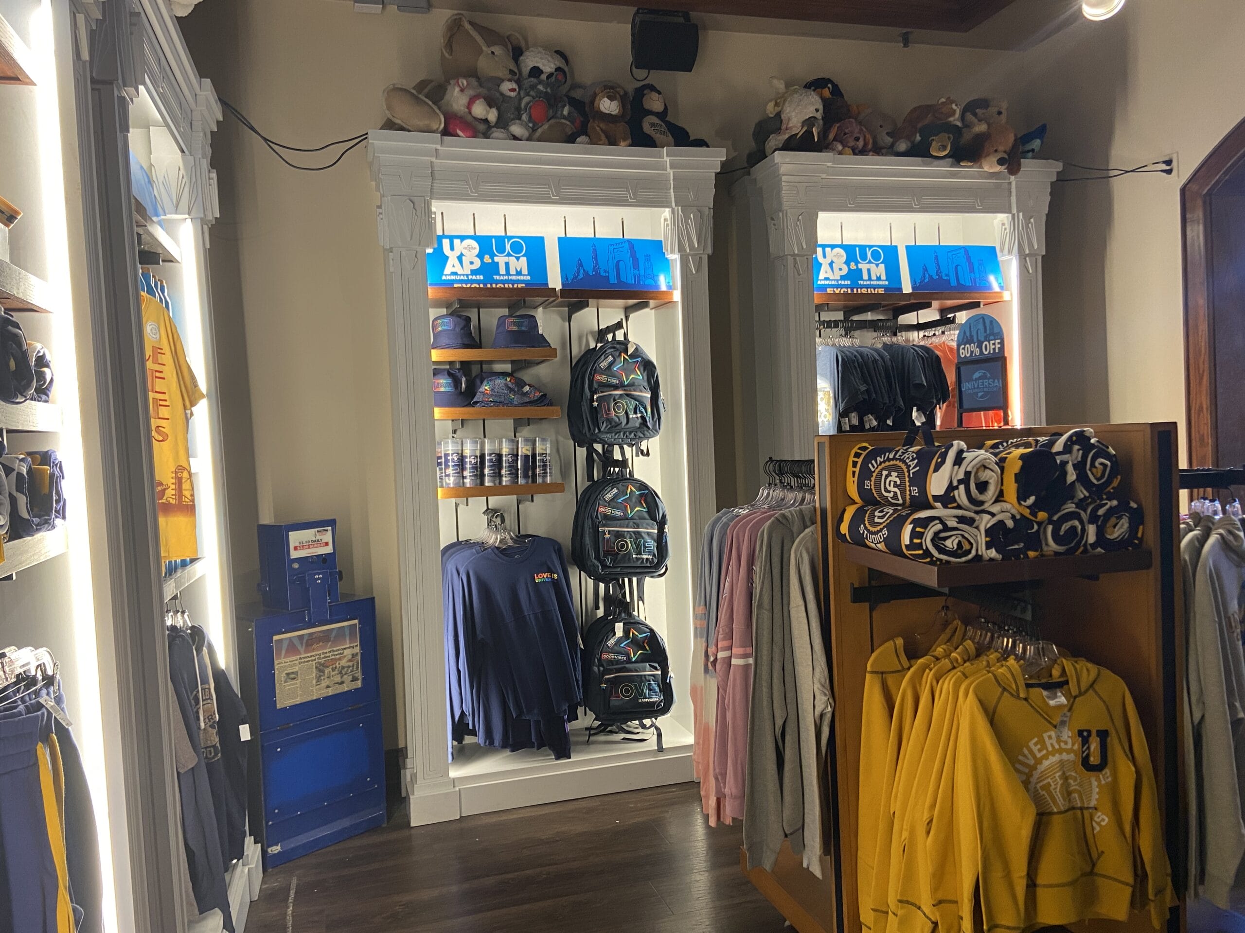 On the merchandise displays are UOAP & UOTM decorations and signs advertising the 60% off. The shelves in this room are topped with plush props.