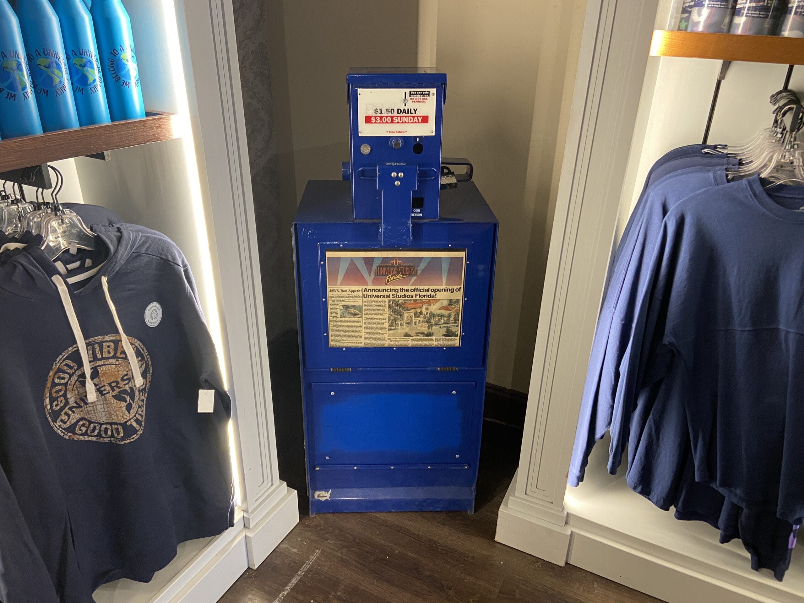 A newspaper stand between the shelves showcases the headline: “Announcing the official opening of Universal Studios Florida!”