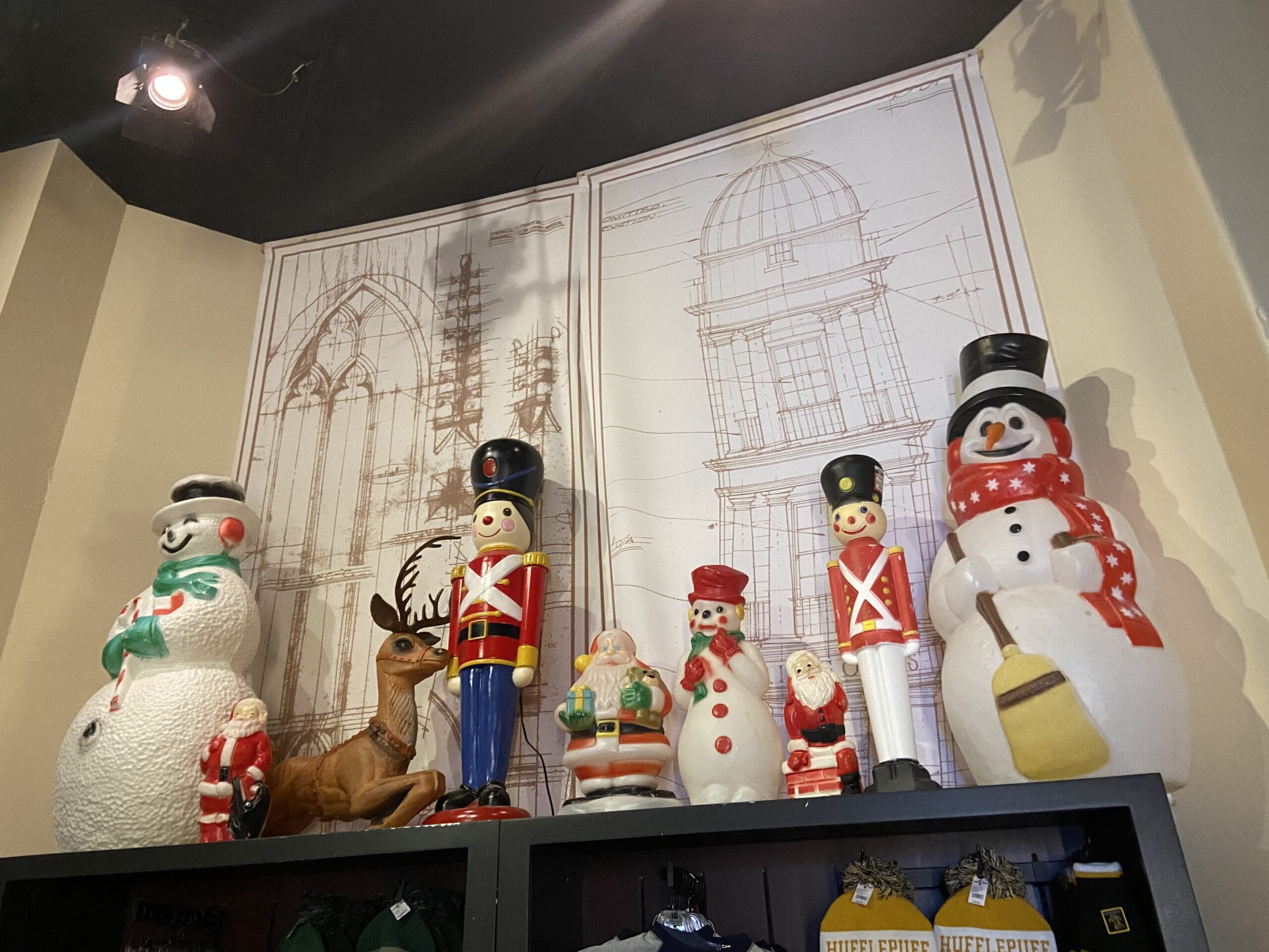 Some schematics are hanging on the wall behind light-up Christmas figures.