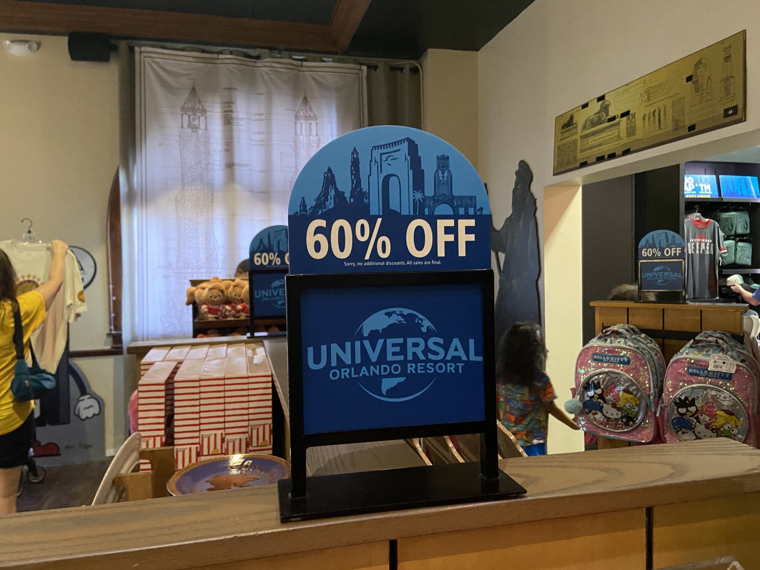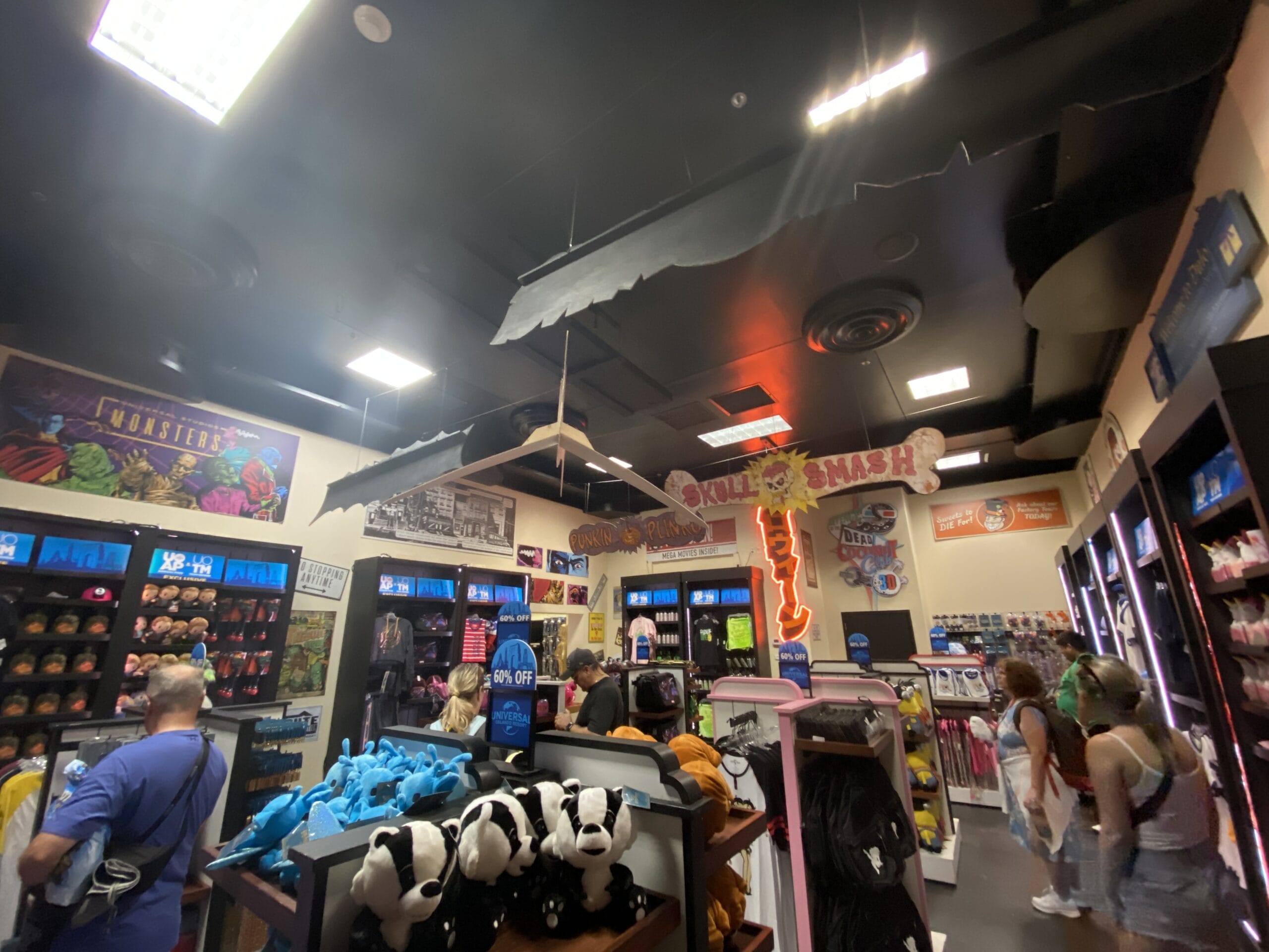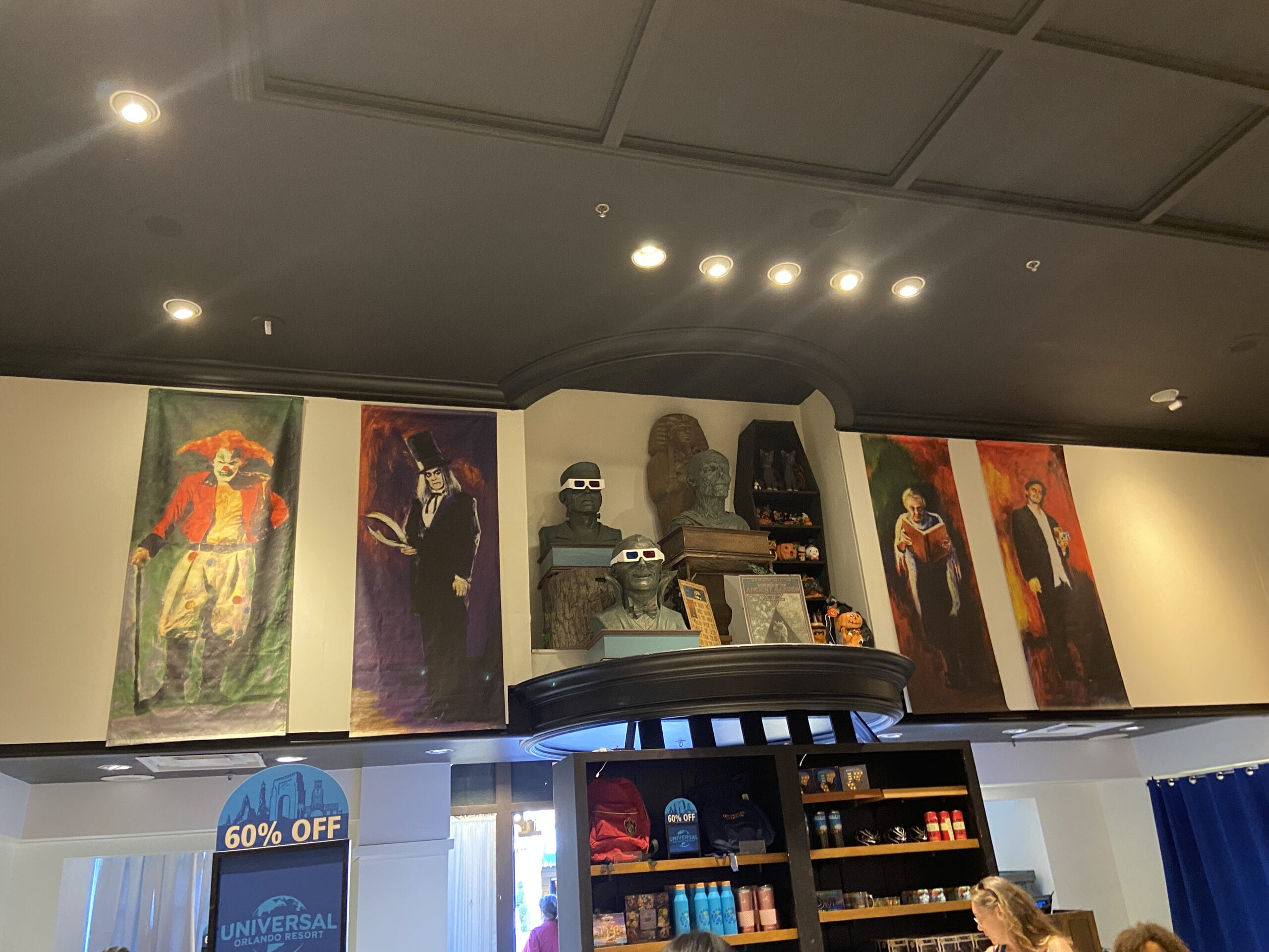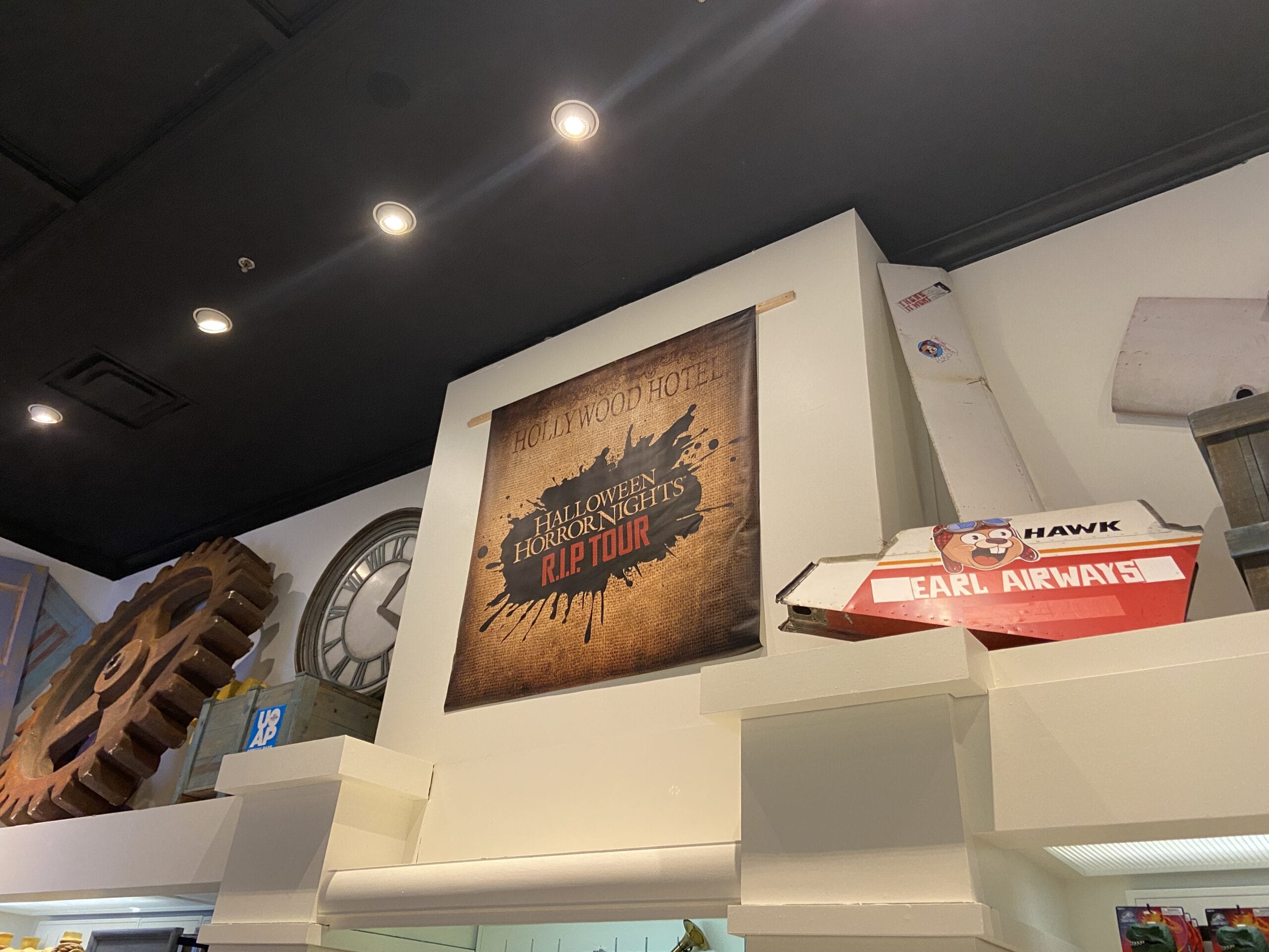 Hanging above the check-out is a banner for the Halloween Horror Nights R.I.P. Tour.