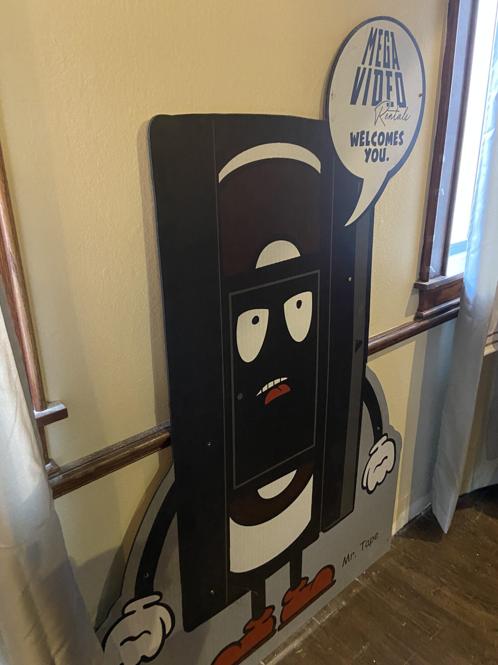 A Mr. Tape cardboard cutout from last summer’s Tribute Store welcomes guests to Mega Video Rentals.