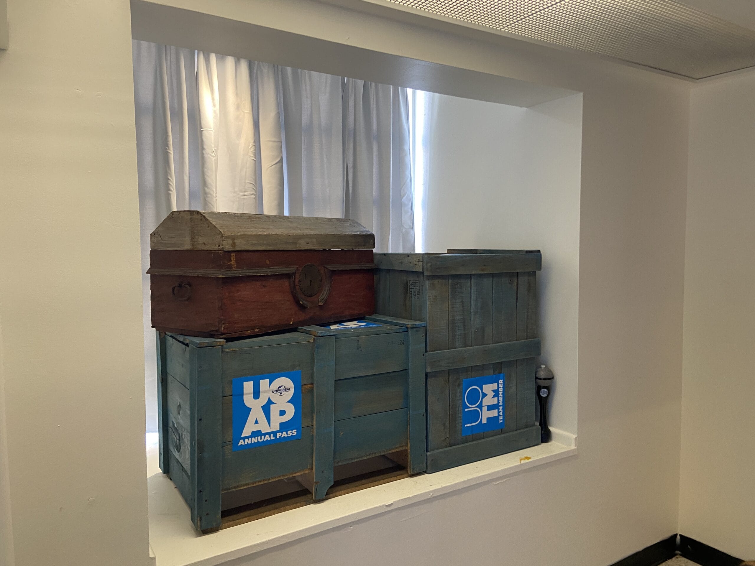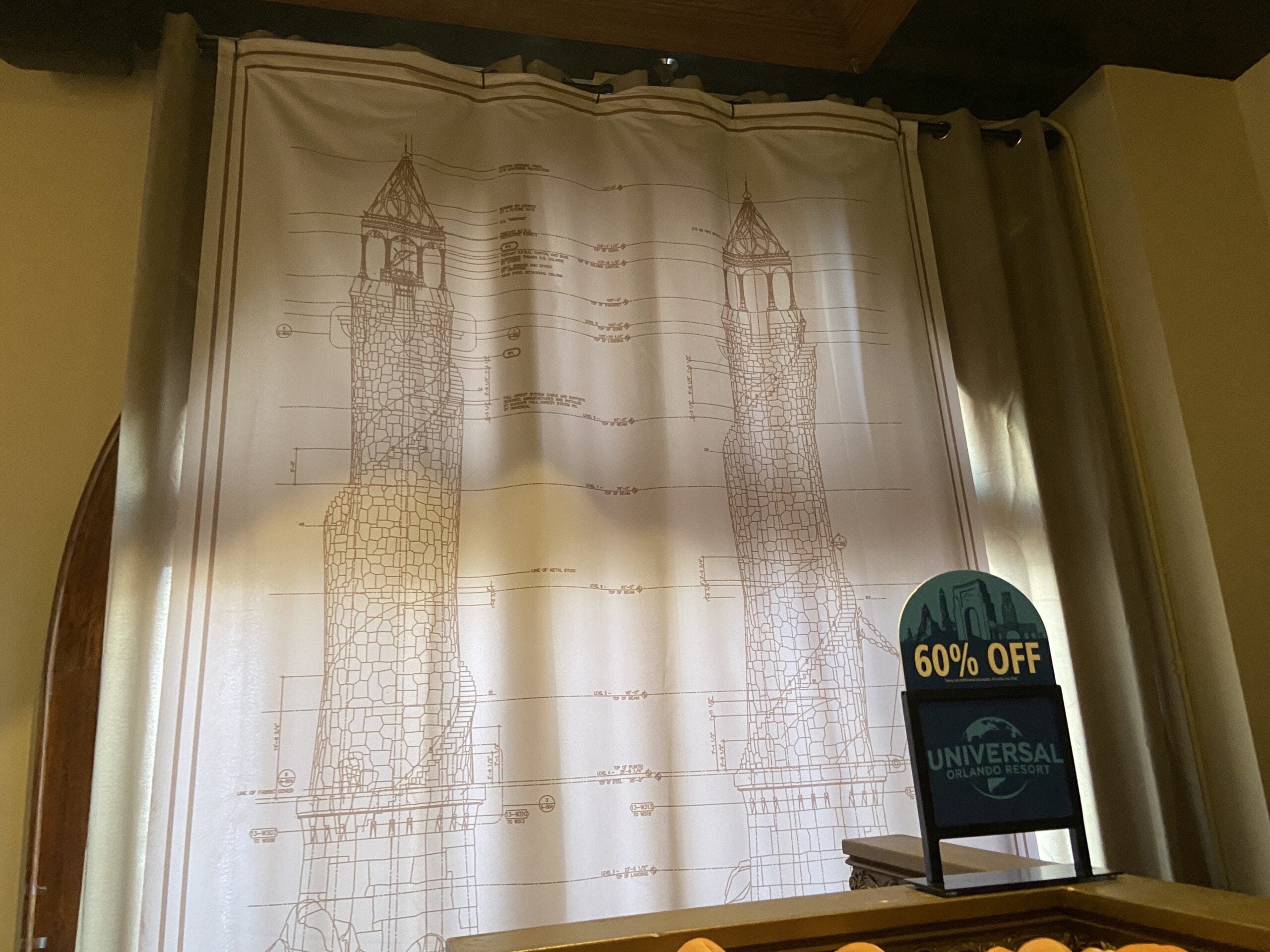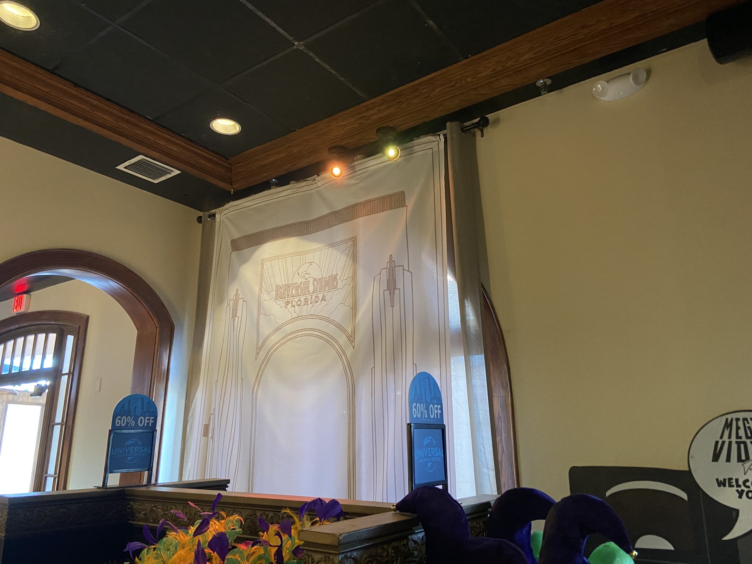 Over the windows are tapestries of the Universal Studios Florida archway and Universal Islands of Adventure tower.