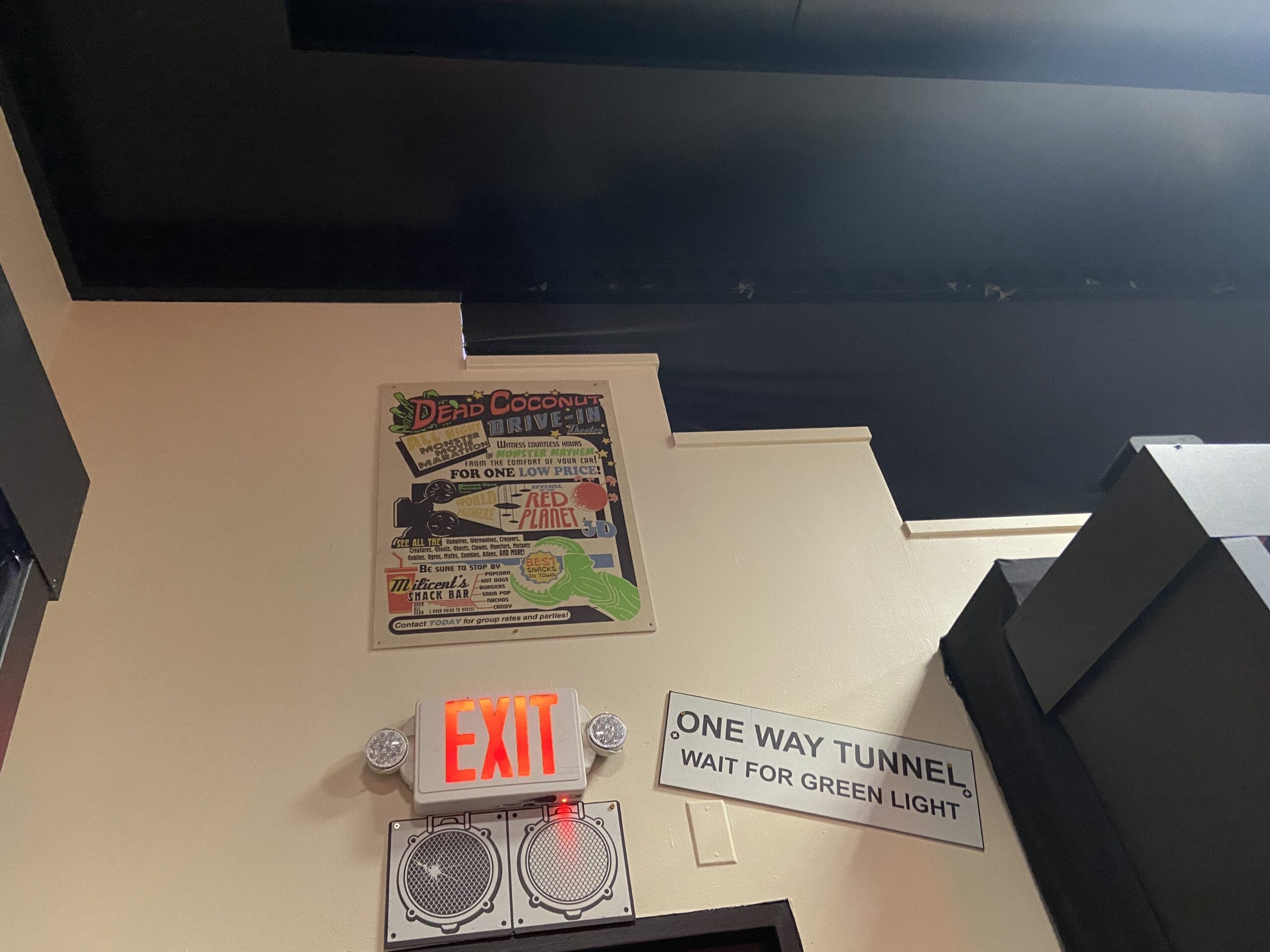 Above the next doorway is a poster for the Dead Coconut Drive-In and the HHN 32 Tribute Store’s reference to the Great Movie Ride.