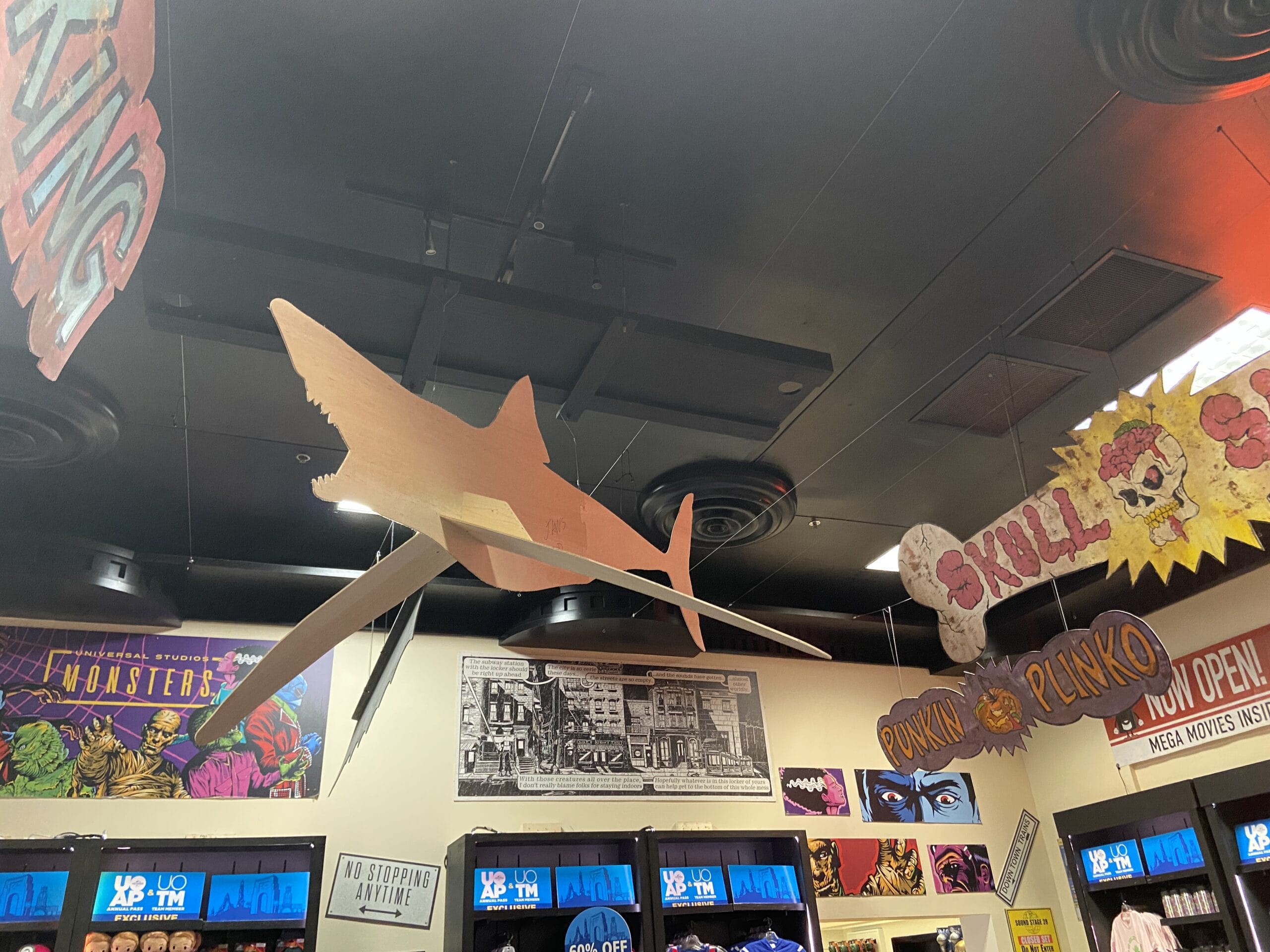 Among the hanging decorations is a shark cutout and ads for various Halloween-themed games.