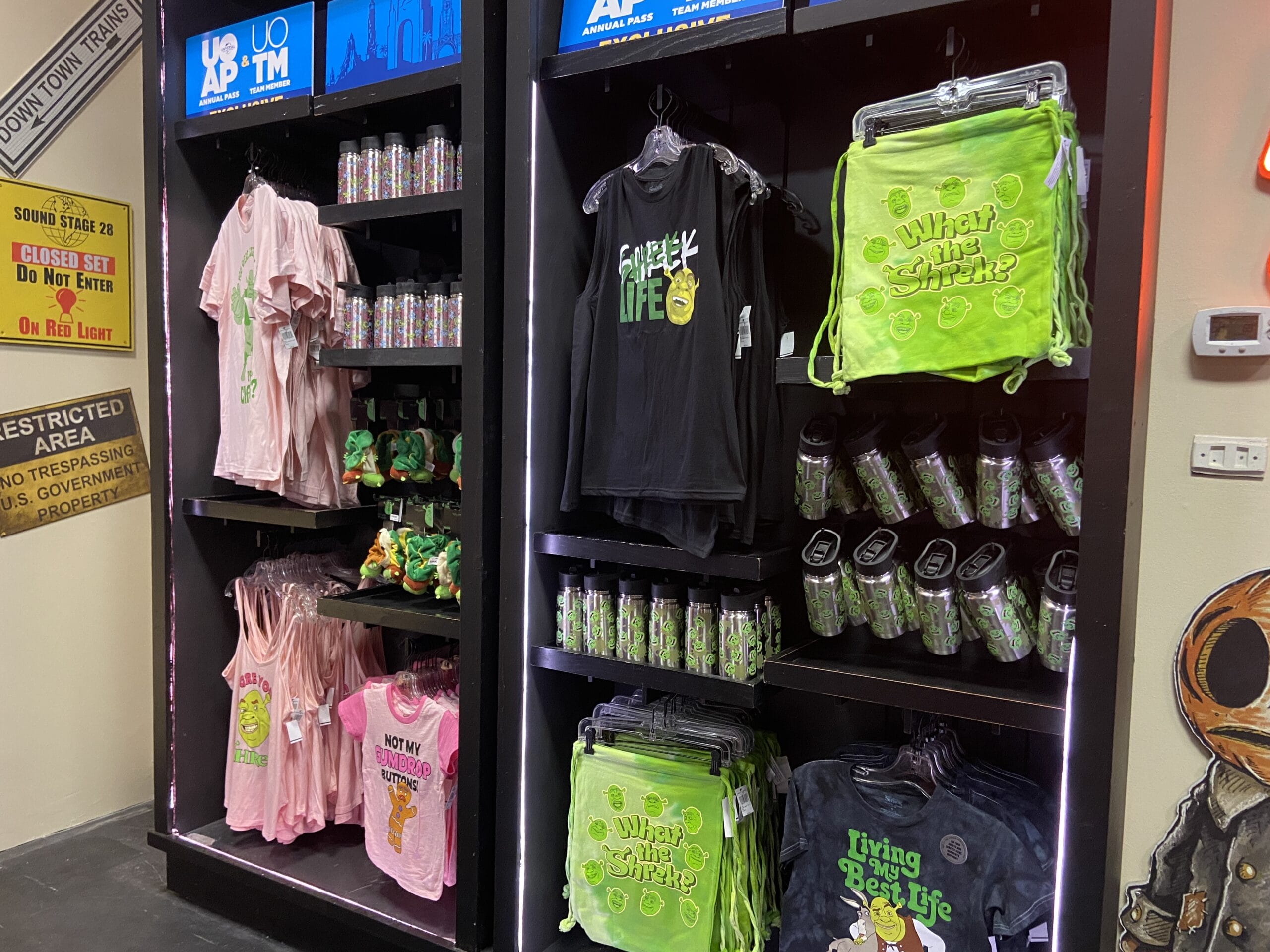 There is Shrek merchandise, including apparel, bottles, and a drawstring backpack.
