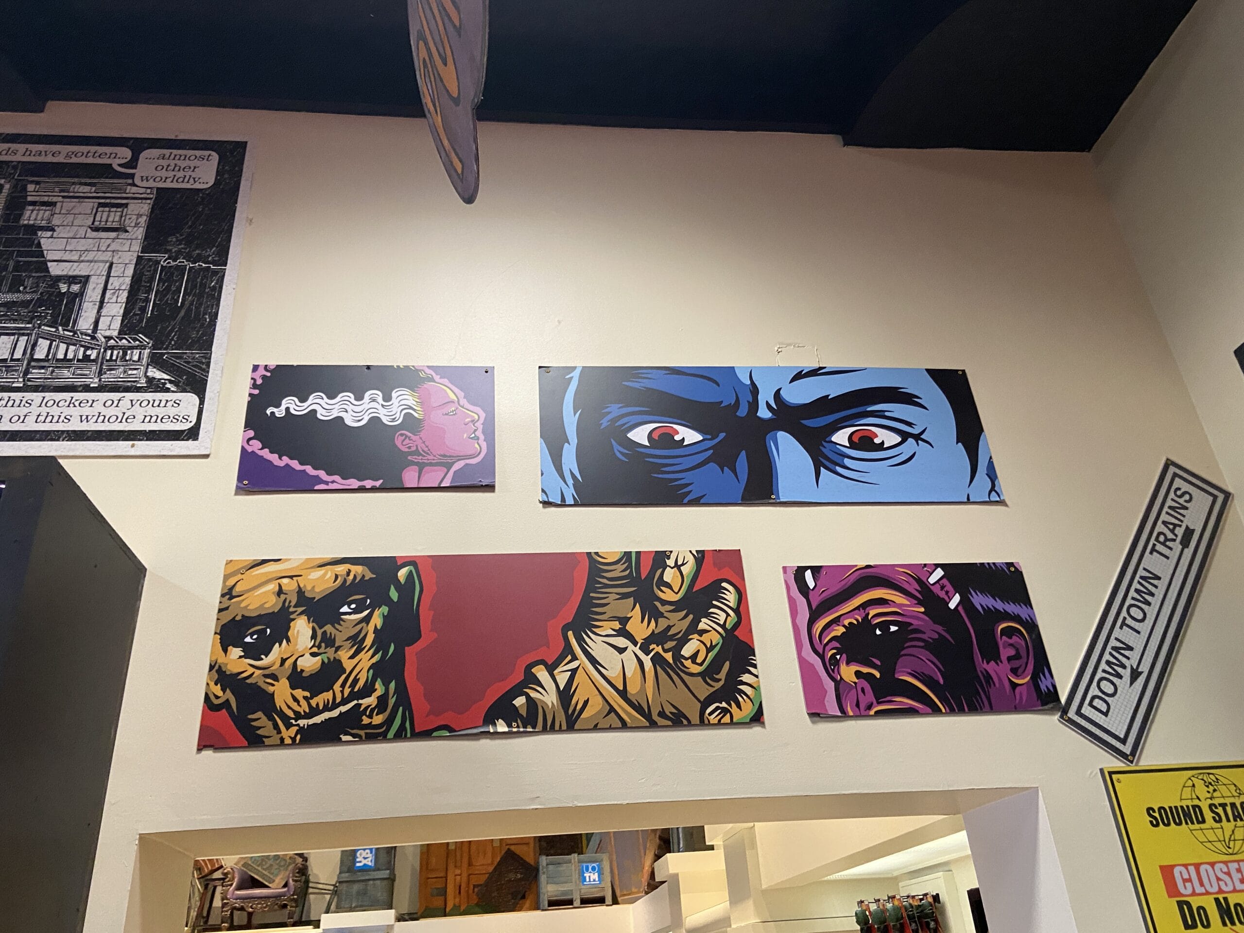 Above the next door are vibrant comic-style images of Universal Monsters.